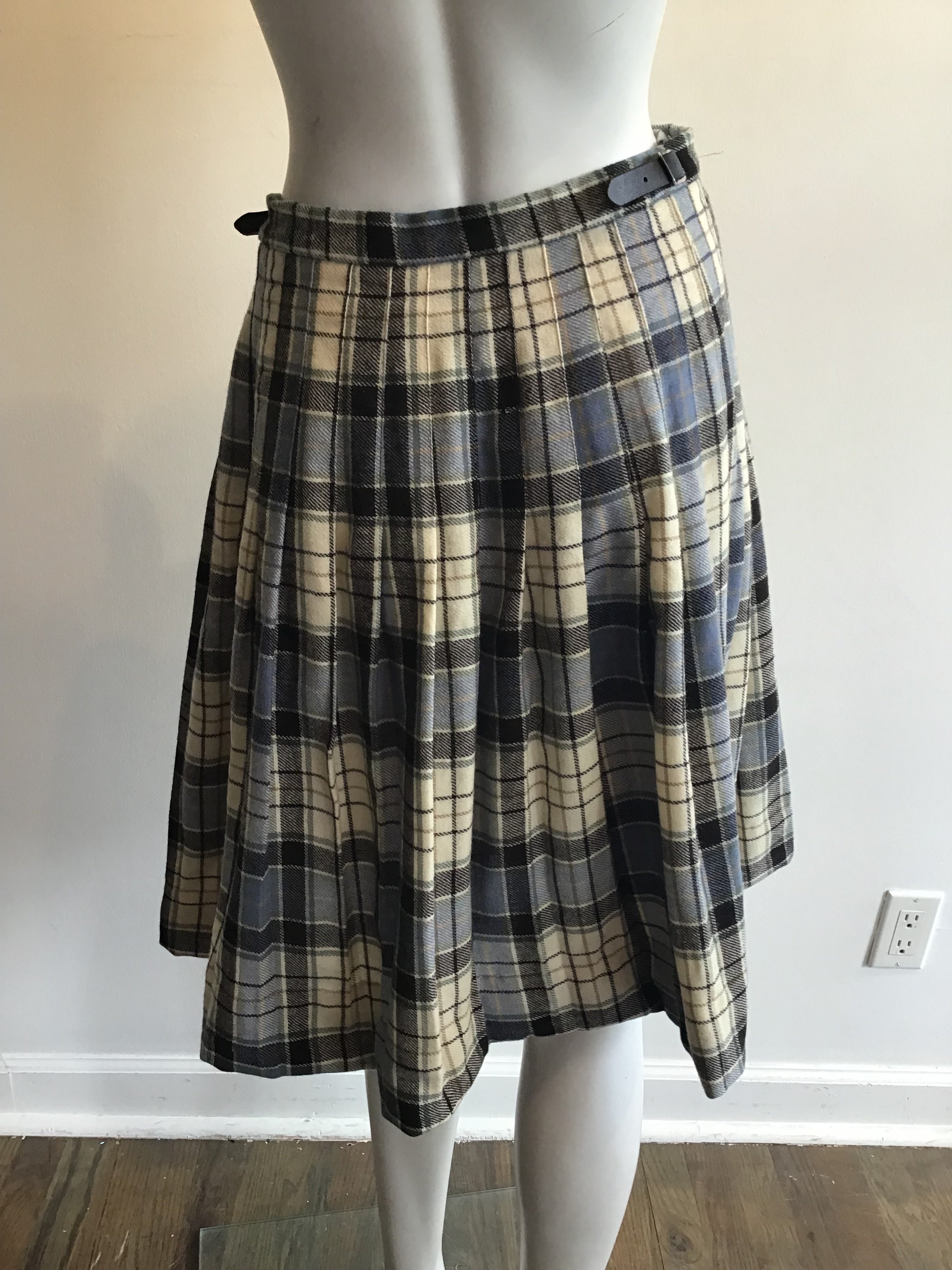 Kilts have been worn for centuries in Scotland, they signified which clan or family you were from. Blue, white and black are in the colors of the plaid. A line skirt has the pleats on the side. This is a wrap skirt which means the inner layer goes first then the outer layer wraps around it and is fastened by 2 small belt buckle on each side. Measures as follows Waist 26, Hips 40, Length 23 Excellent condition