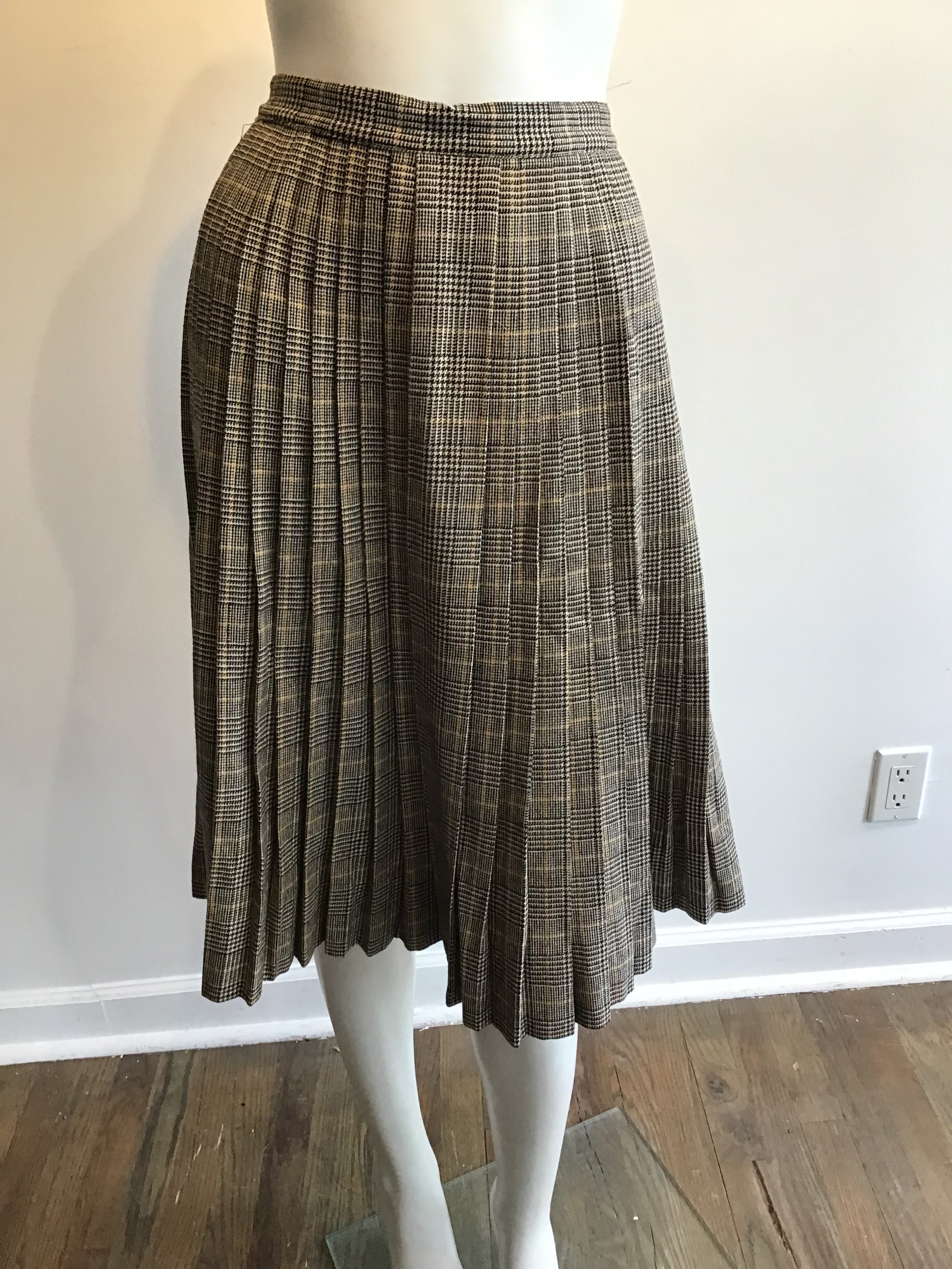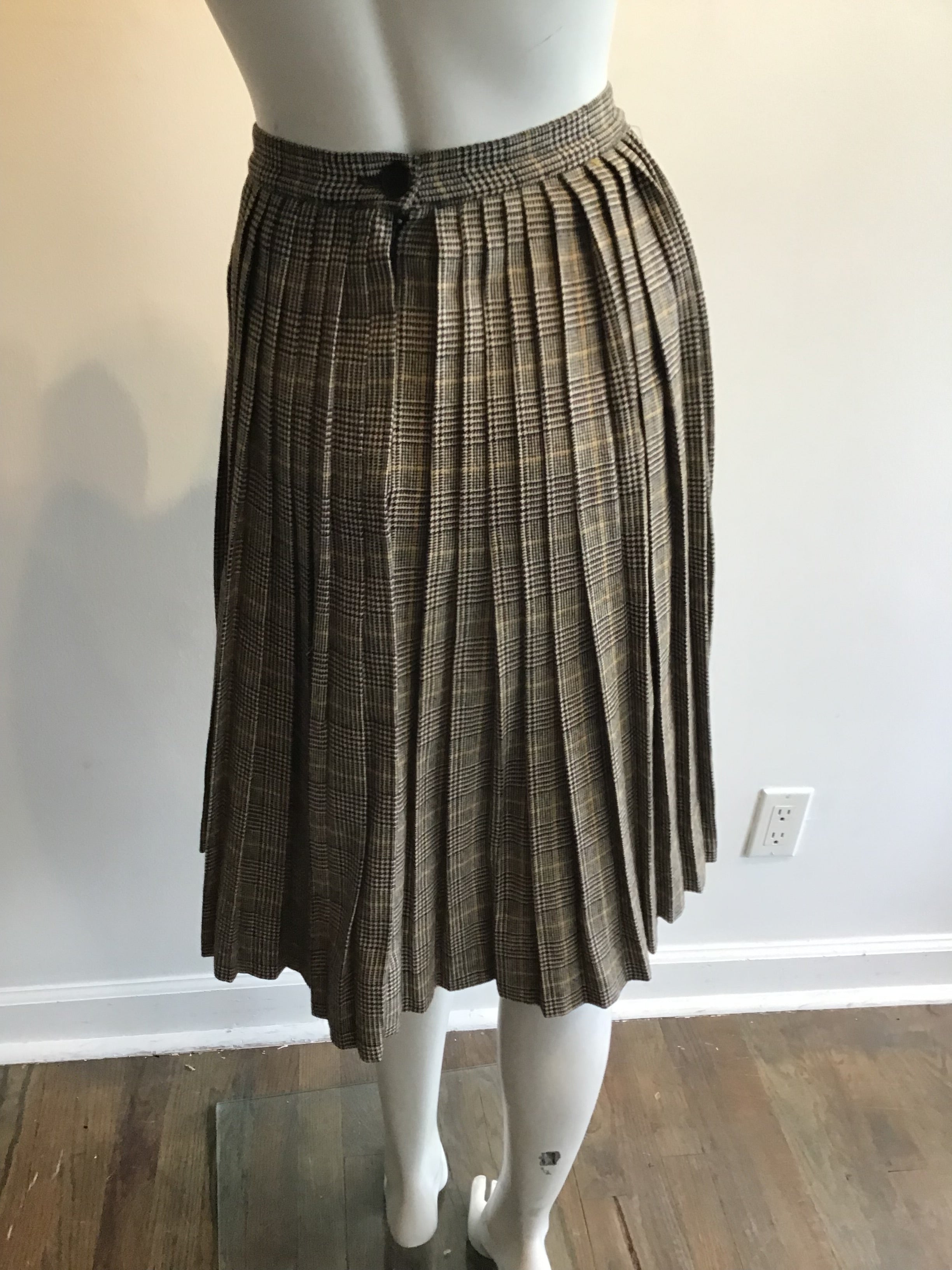 Kilts have been worn for centuries in Scotland, it was worn to signify which Clan or family you were from. Tan, gray and black are the colors in the pleated skirt. The skirt zippers up the back with a button at the top for closure. Measures as follows Waist 28, Hips up to 40 length 26.5 Excellent condition