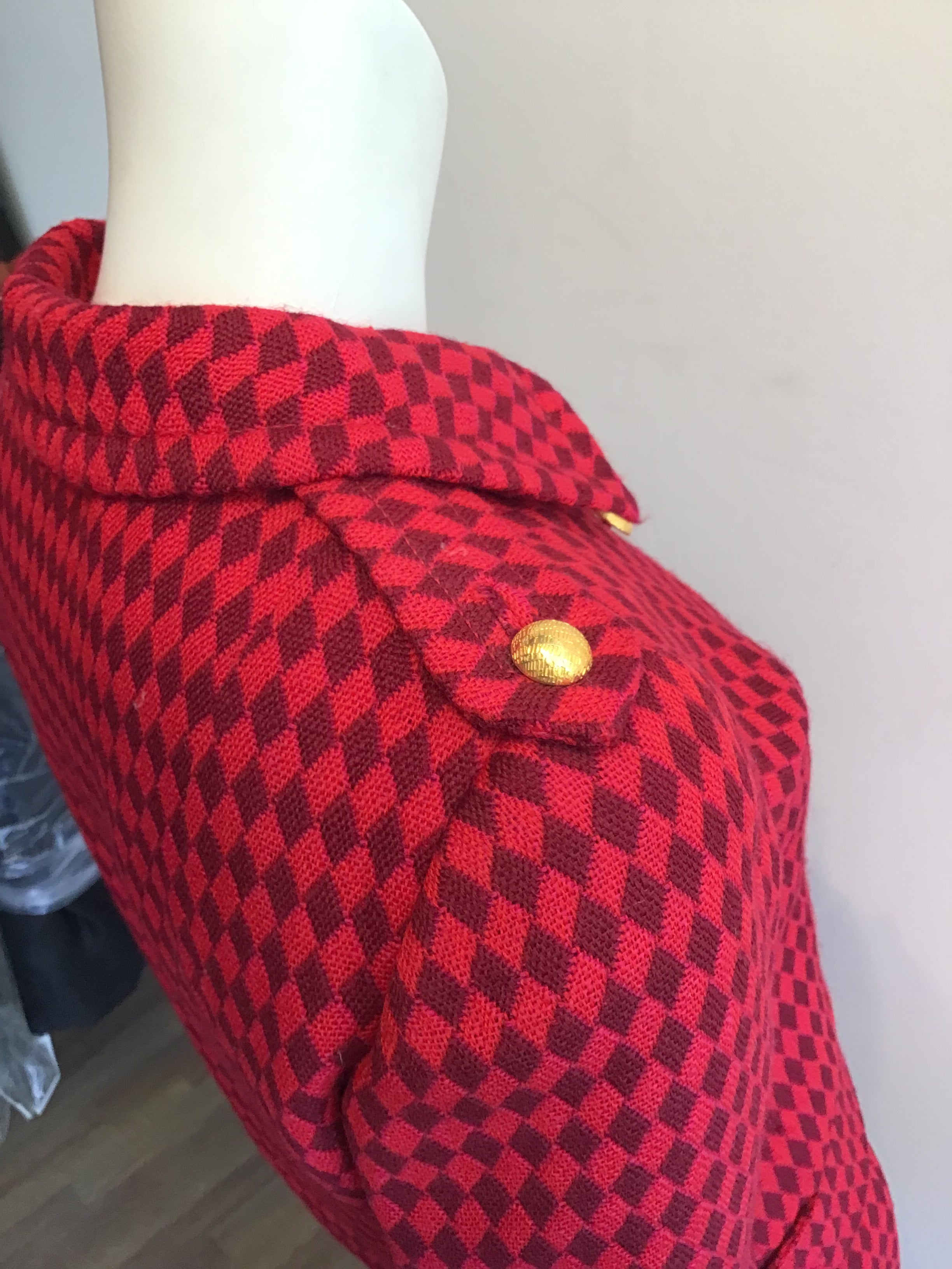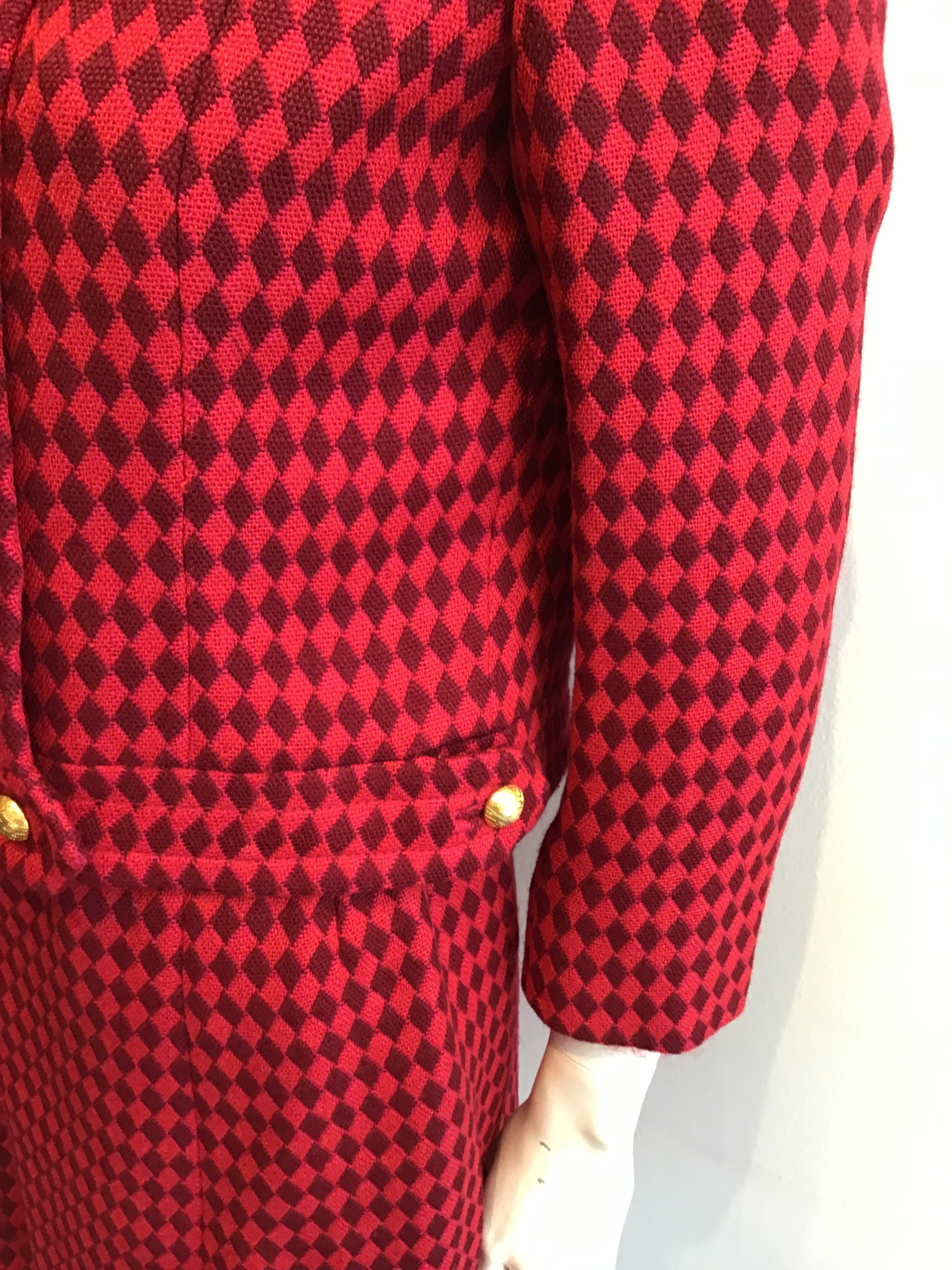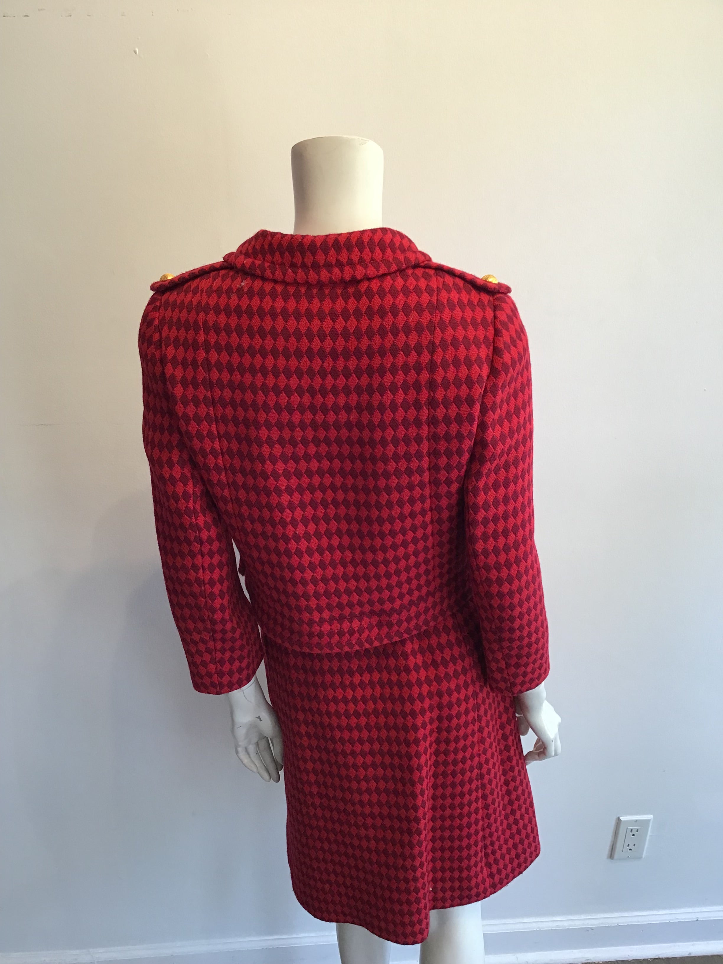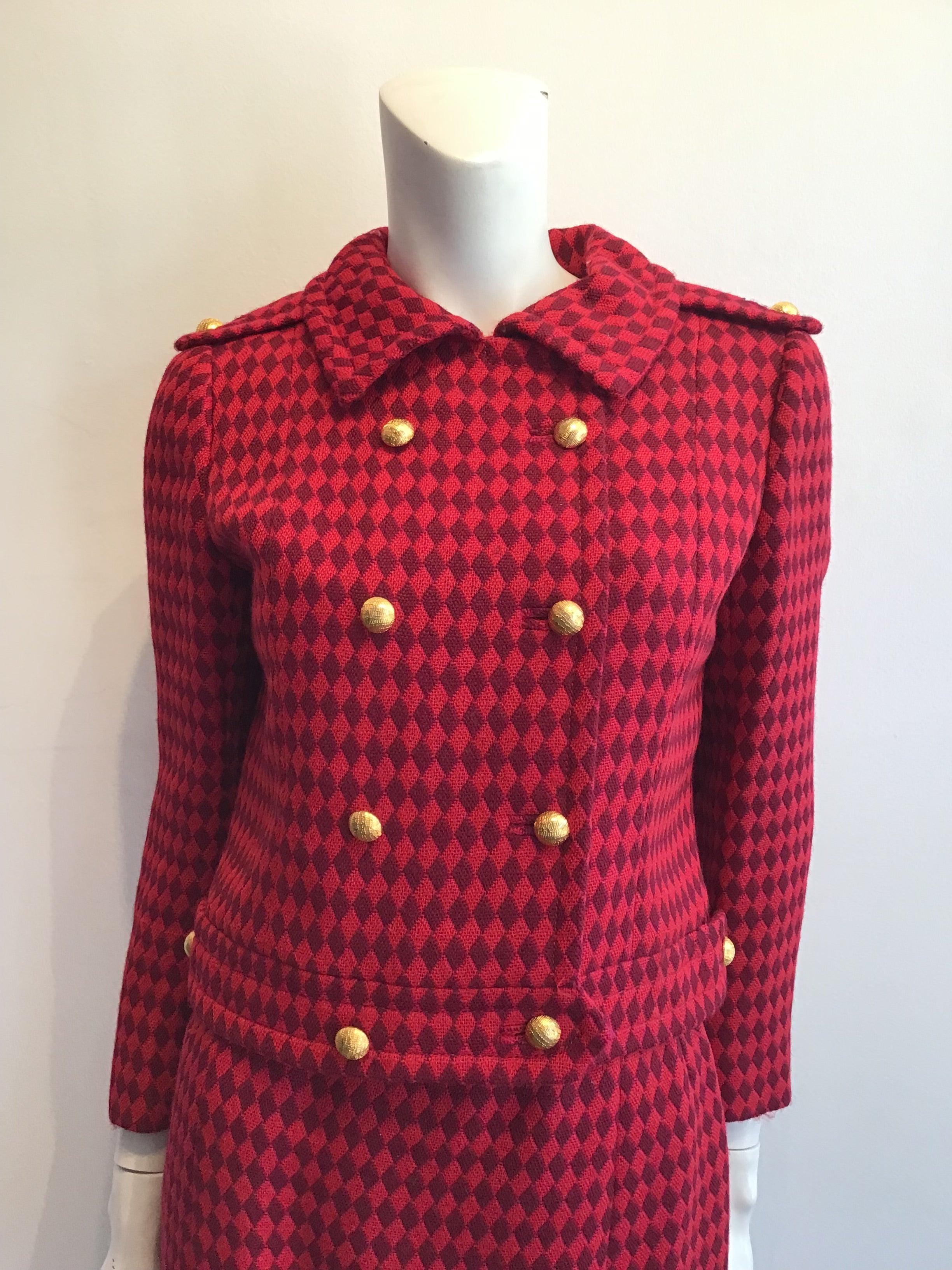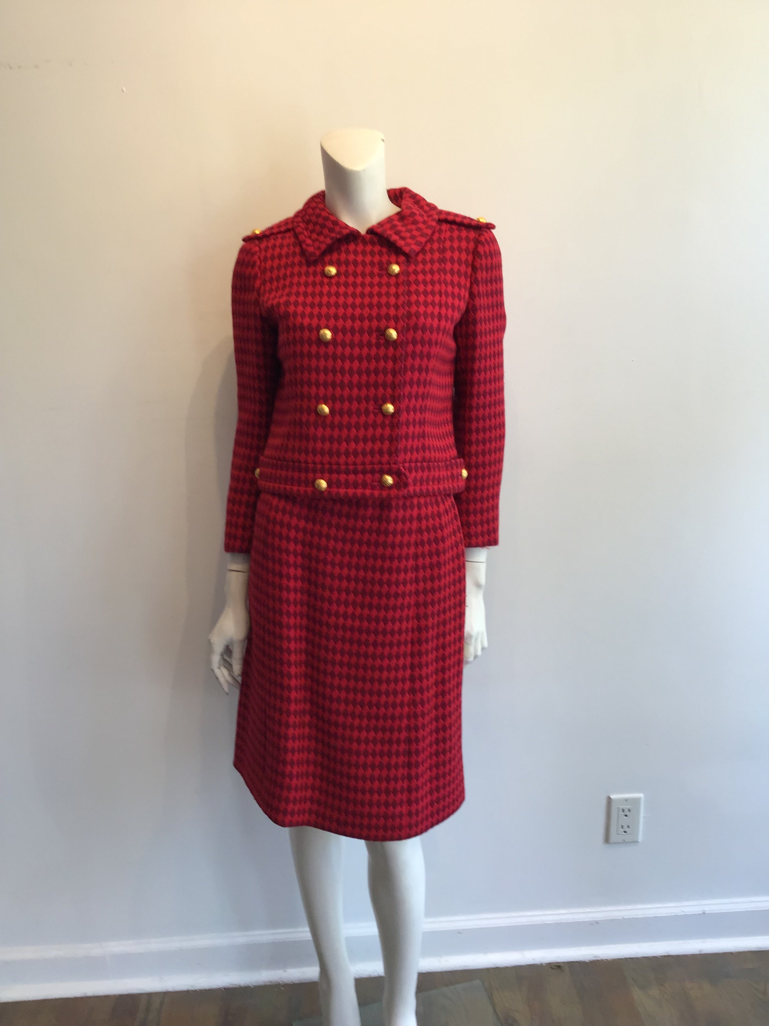 Rose Bertin was the dress maker to Marie Antoinette and the French Nobility. She barely made out of Paris during the French Revolution. In 1949 2 Swiss businesswomen got the rights to Rose Bertie’s name and opened a Haute Couture House in Zurich. They imported the latest French fashions and copied them for their clients. This wool suit is made of the finest wool done in the harlequin diamond pattern. The jacket is designed in the straight boxy look which means it comes straight down not coming in at the waist. 2 epaulets at the shoulders give it interest. The sleeves are what they called glove length which meant that they are shorter to show of the gloves which were usually decorated especially with embroidery.. 2 rows of gold buttons come down the front. The buttons are how the jacket closes. There is a wide band above the hem which is pure decorative. Skirt is knee length and is also straight with a slight flair. The skirt has 2 zipper for closure a haute couture design element. Measures as follows Shoulders 15, Sleeves 22, Armhole 7, Bust 34, Waist 28, Hips 38, Length of Jacket 19, Skirt 22.5 Excellent condition