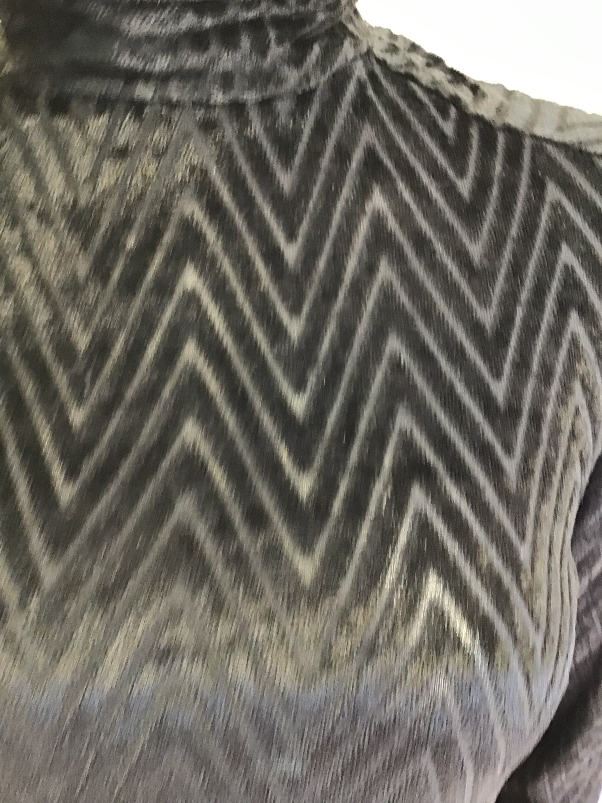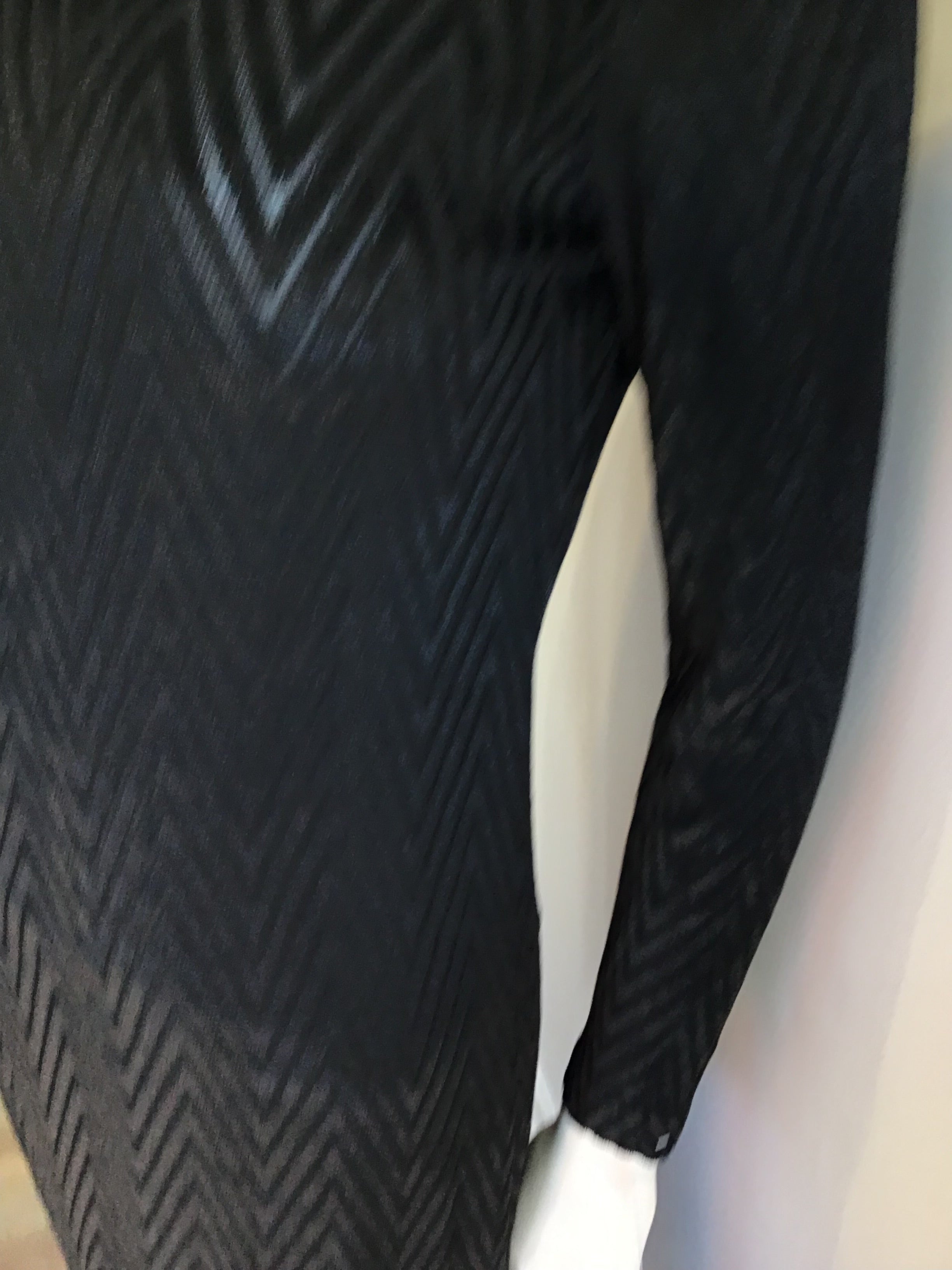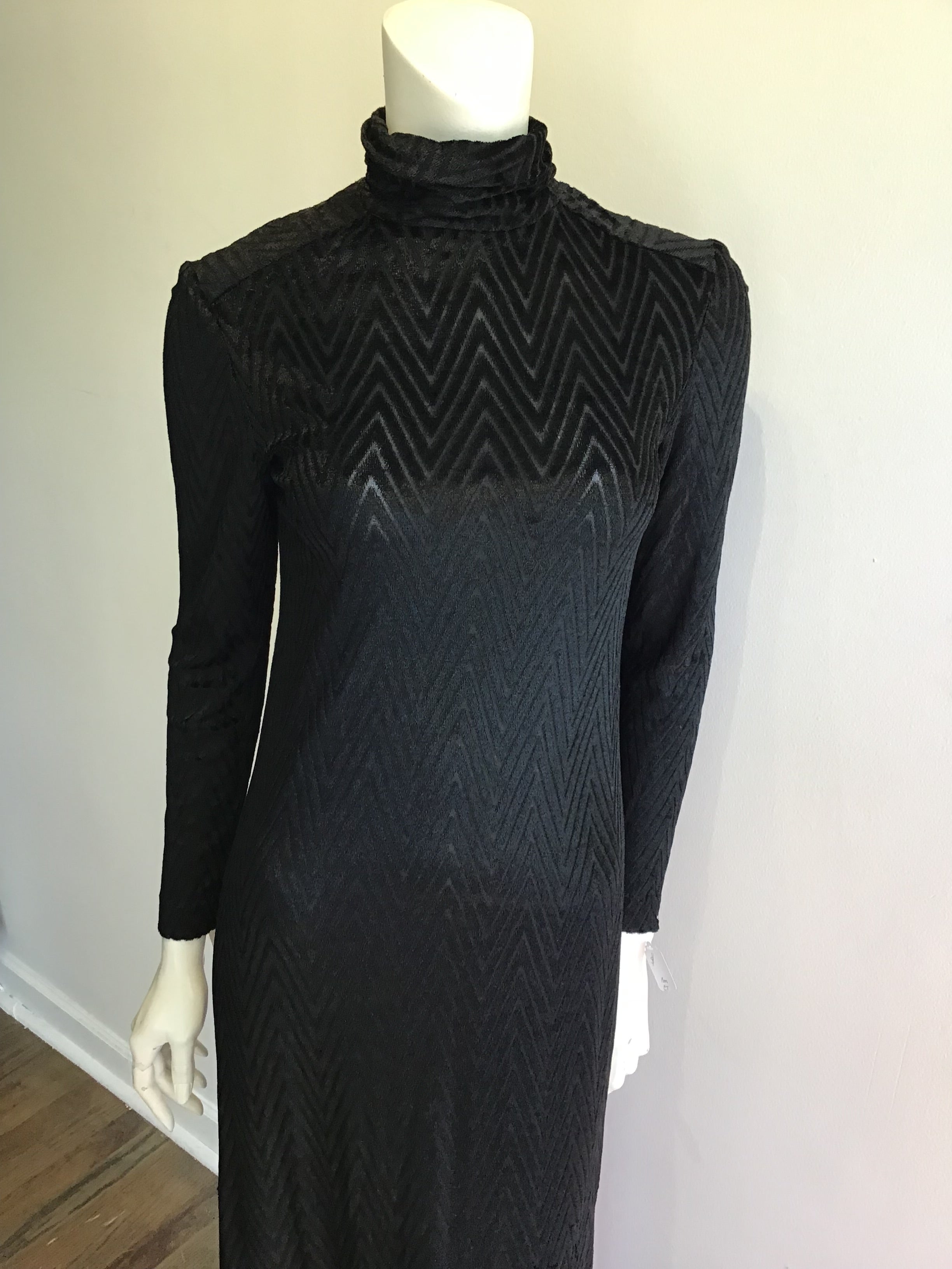 The herringbone pattern of this dress is killer. The way it picks up the light when you move! Cole collars were very in vogue in the 70s. Fitted sleeves and bodice really show off the fabric. Straight skirt has a long slit on the left side. Does have a matching belt that was ties loosely. Zips up the back for closure. Measures as follows Shoulders 14, Sleeves 24, Armhole 7, Bust 36, Waist 26, Hips 38, Length 56 Excellent condition