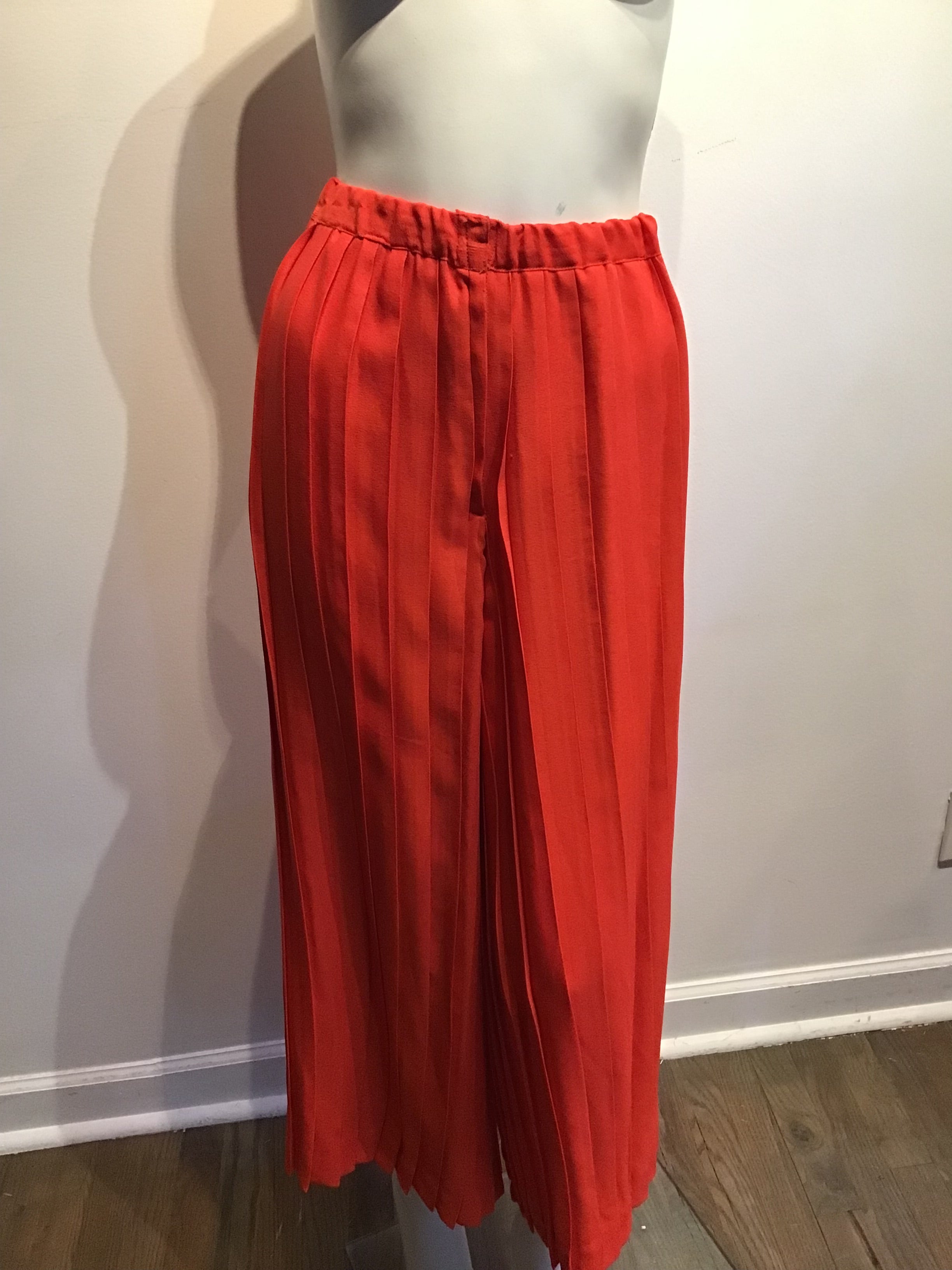 The palazzo style pants were a trend in the late 70s. They are wide to look like you are wearing a skirt. These pants are pleated from the waist to the hem. The waistband does have a little stretch to it. Zips to close. Measures as follows Waist 28, Length 37 Excellent condition