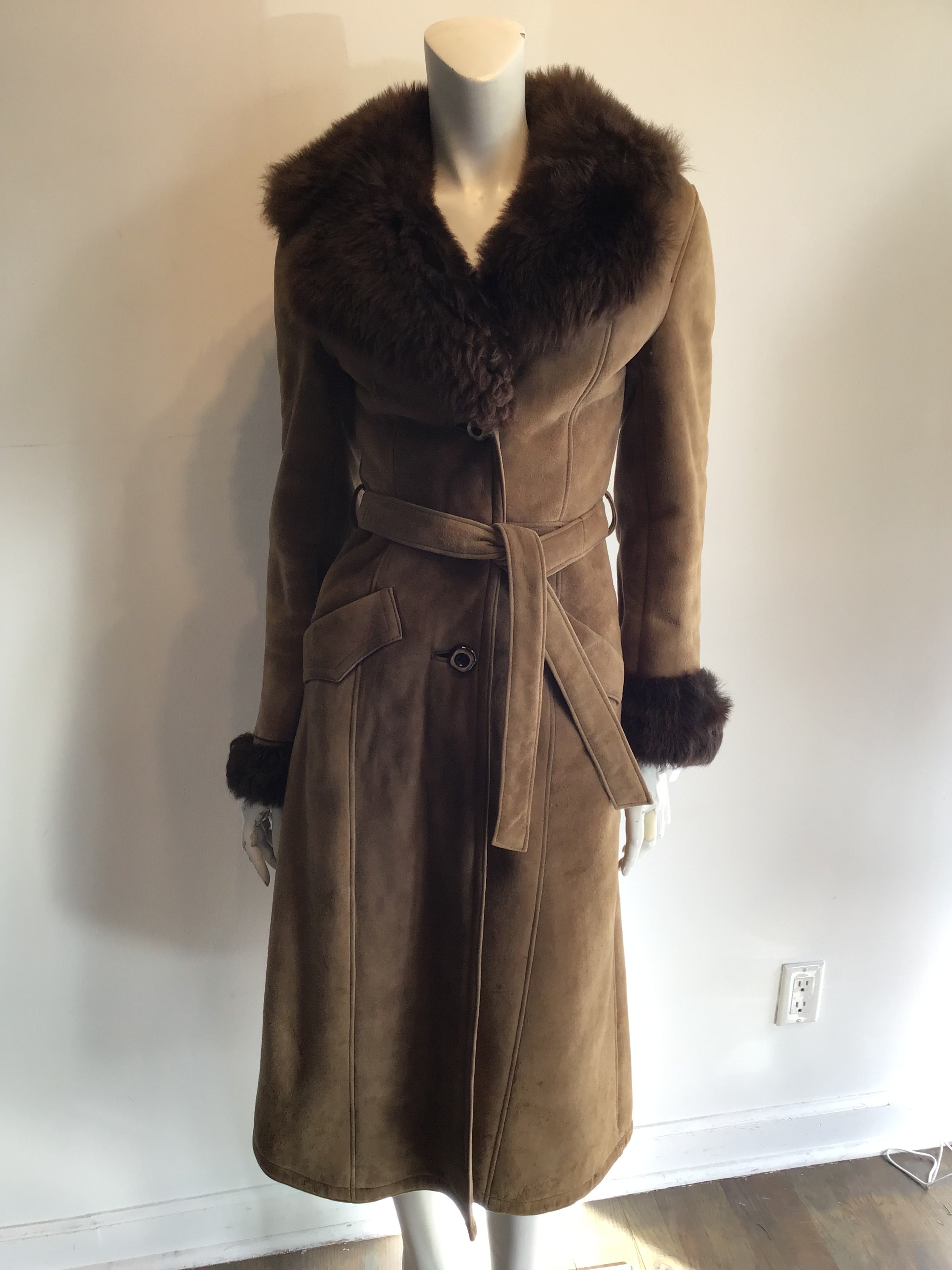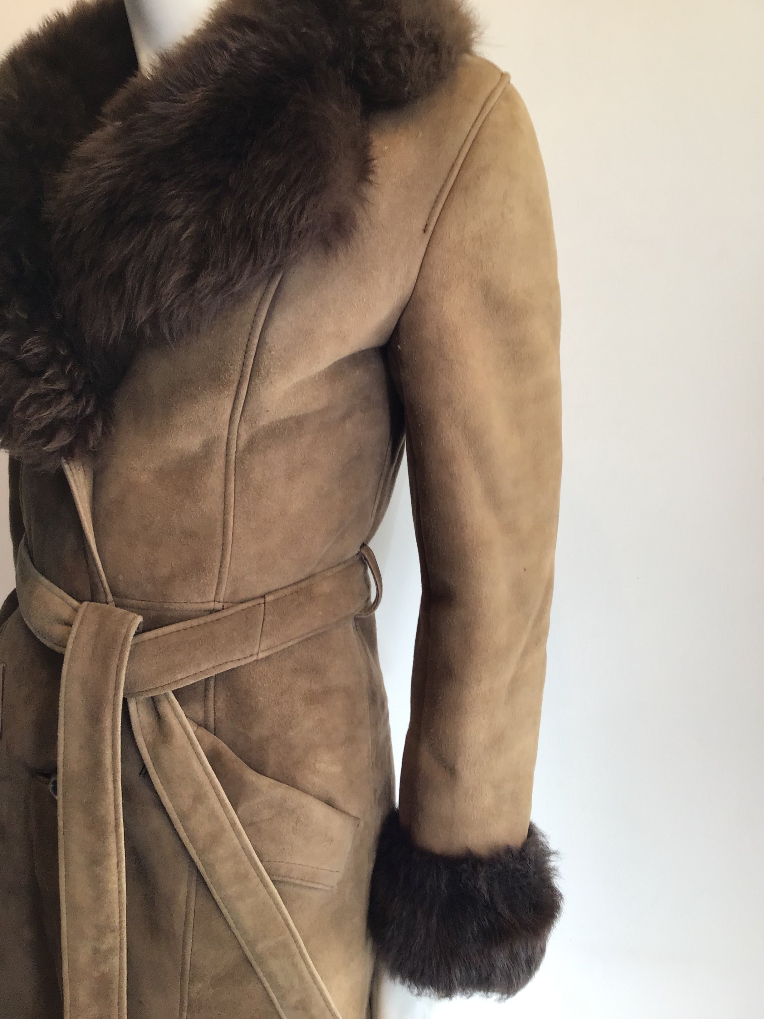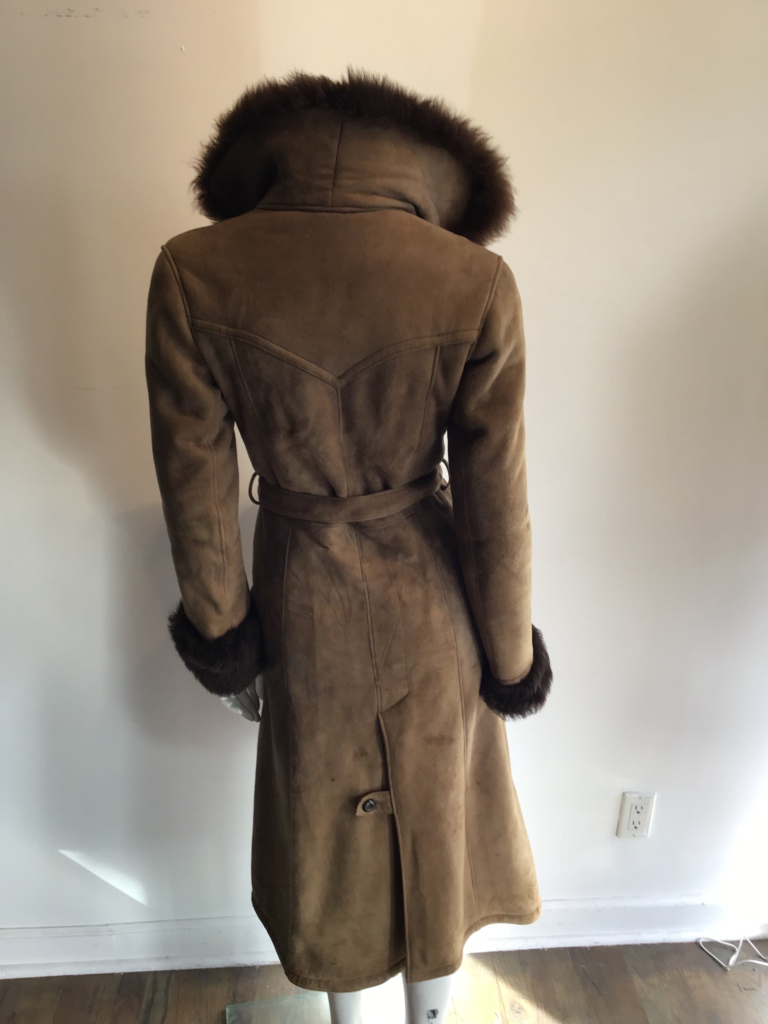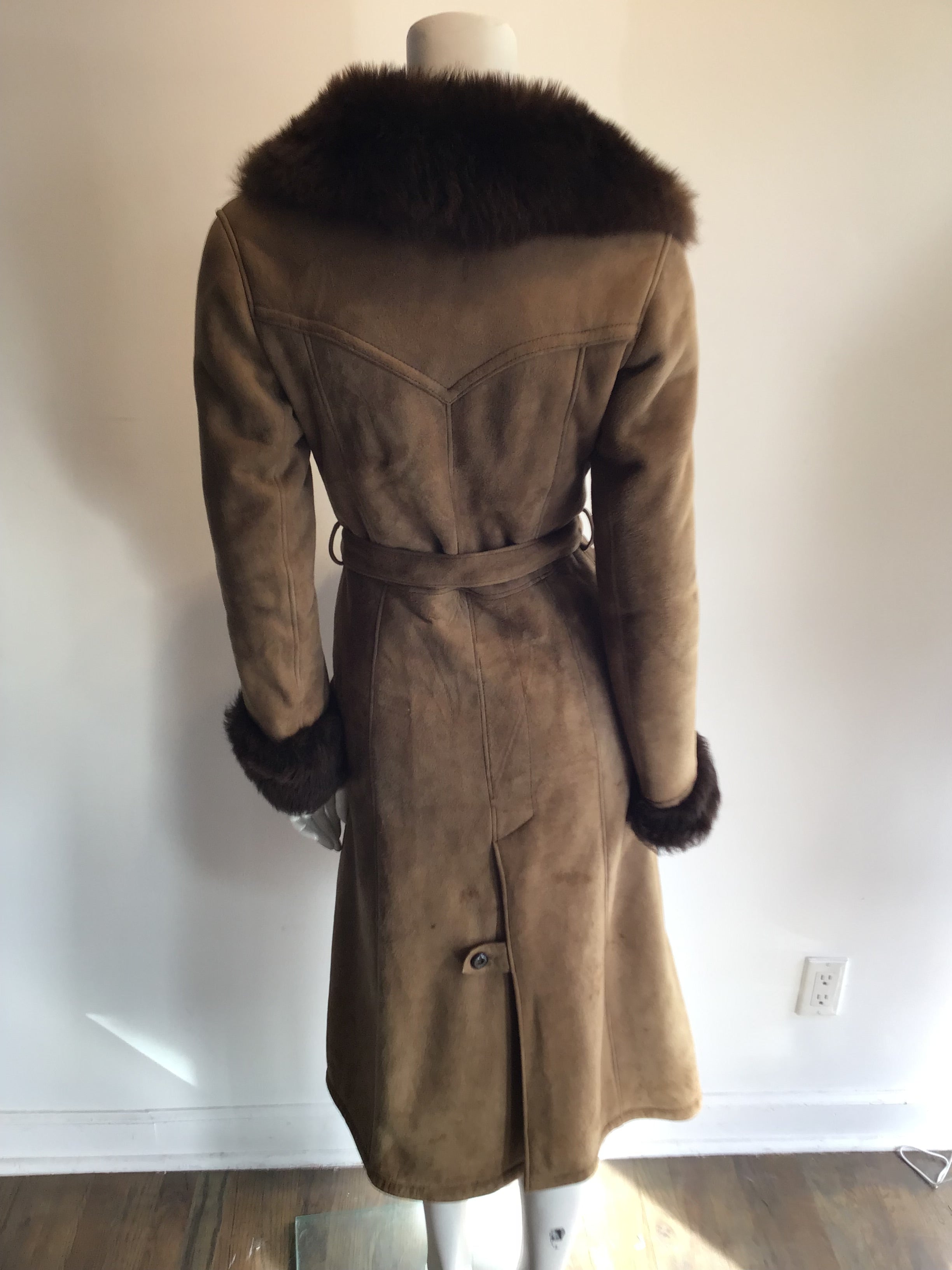 This coat comes from Spain, the one label says made in Spain. Could not Photograph it it for it as small and twisted. The 70s brought hemlines down who the kneee or below. The oversized collar and cuffs have long fur faux trim. The lining is plush. The design is a trench coat style with 3 plastic buttons down the front for closure. Belted at the waist with a matching suede belt. Angled pockets have a flap over that is sewn down.. Fitted bodice with a raglan sleeve are a characteristic of 1970s coats. The back has triangular detailing at the shoulders blade and a vent at the bottom that can be closed with one button . Measures as follows Shoulders 14,Sleeves 23, Armhole 8, Bust up to 36, Waist up to 27, Hips up to 40 Length 45. There are some staining on the bottom in the front and back from walking in winter weather