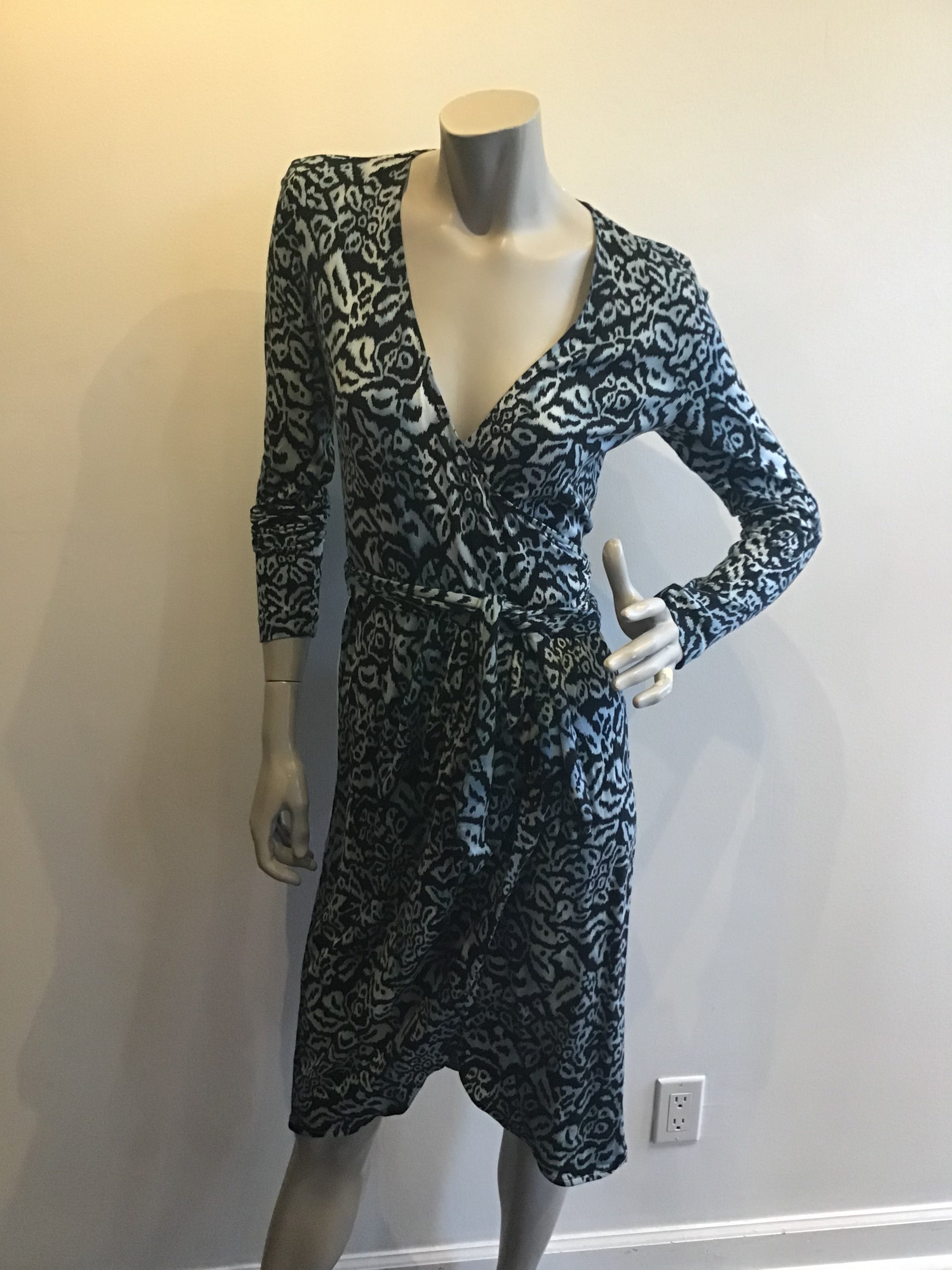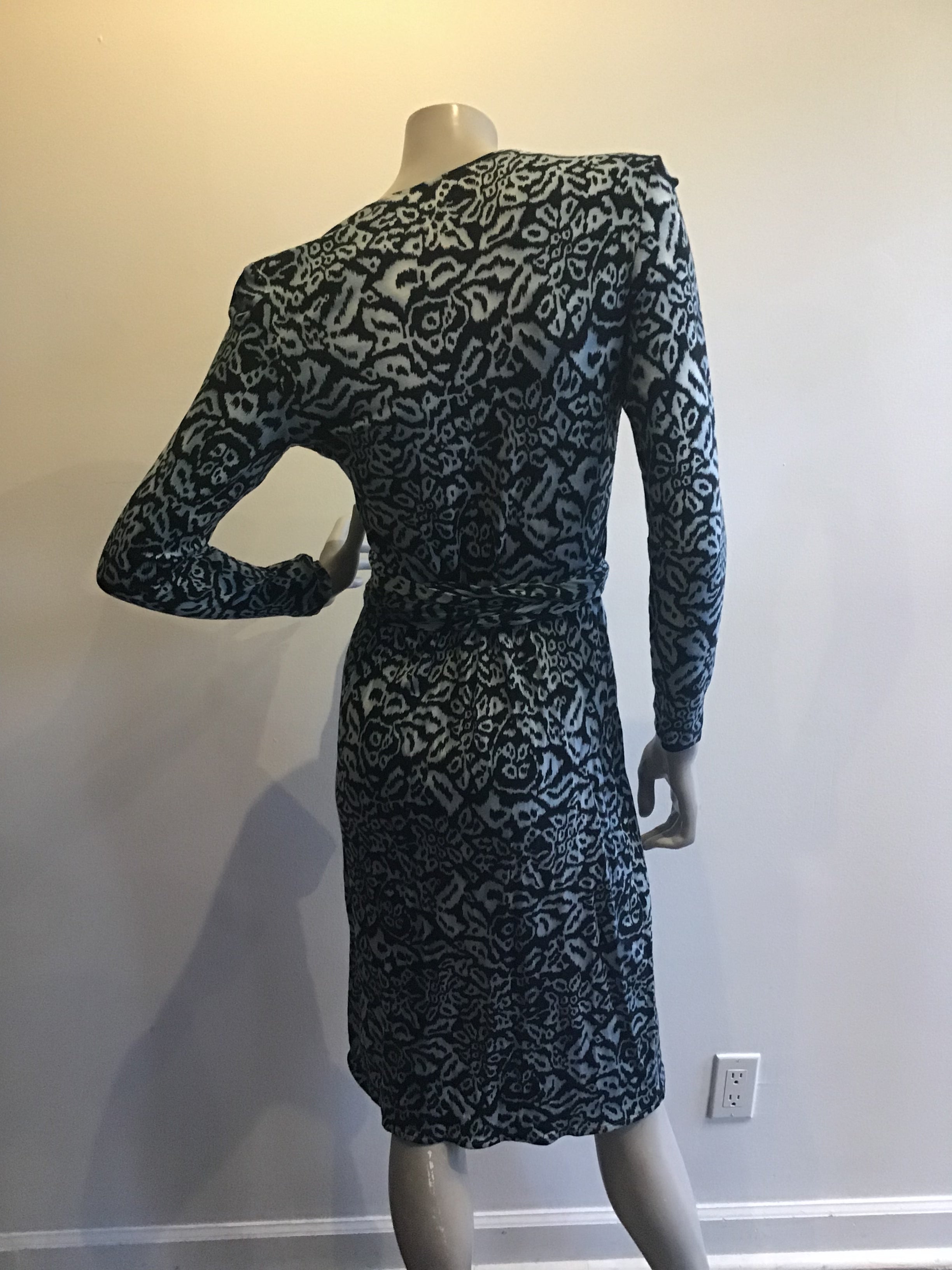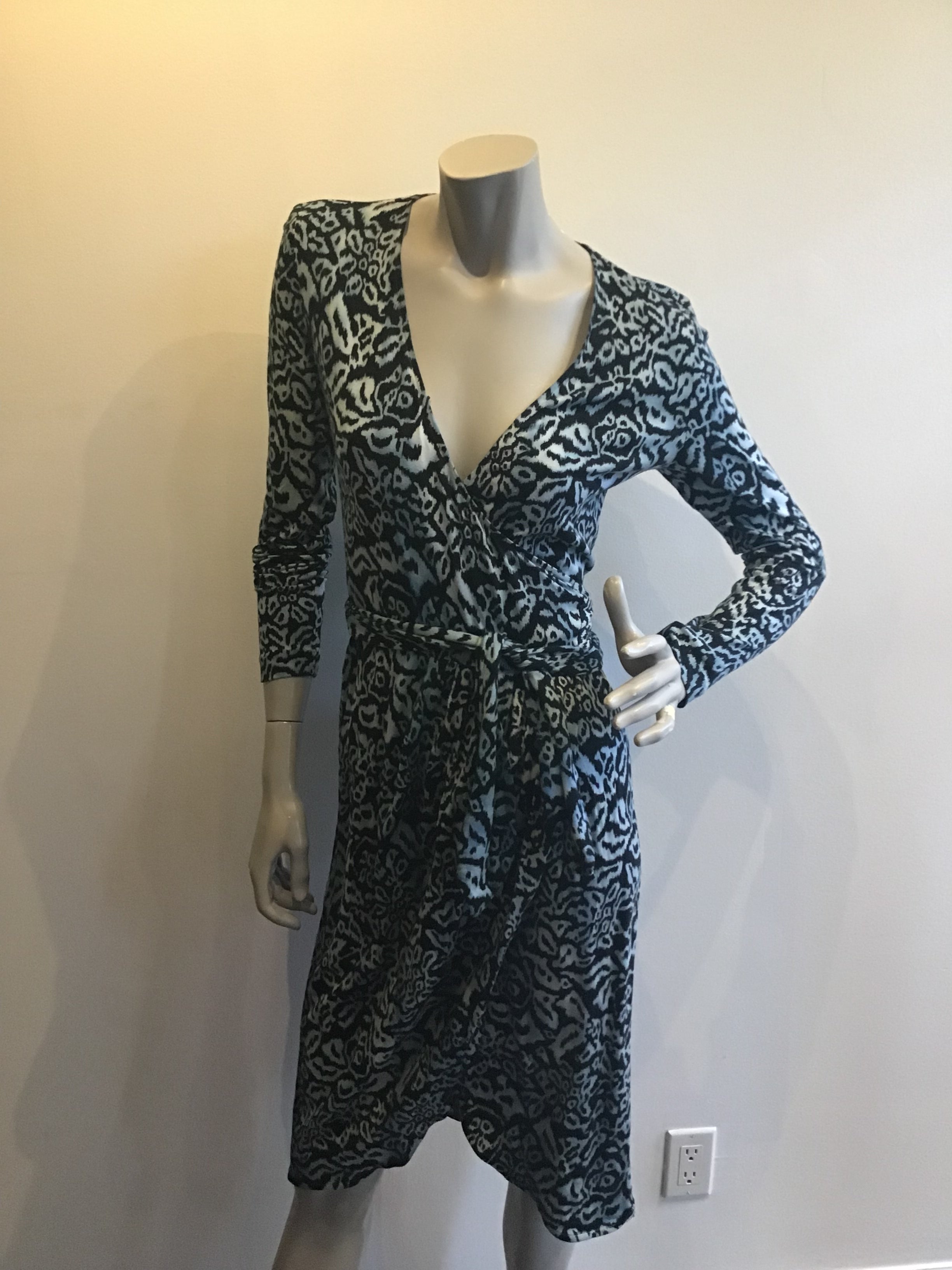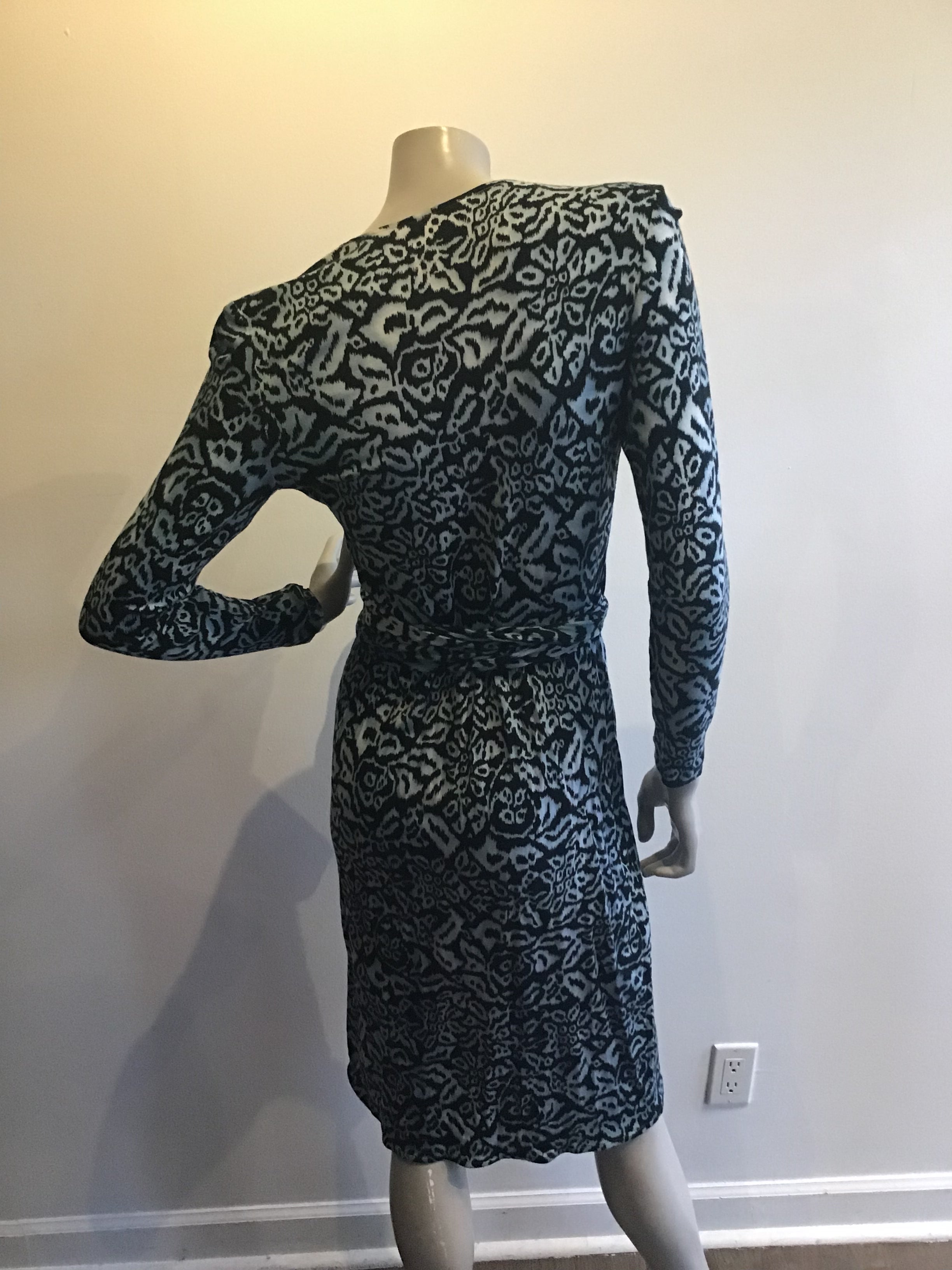 The workings woman needed clothes that were easy to put on and stylish at the same time. Diane Von Fürstenberg designed her wrap dress for her.. easy to put on put one of the tied through the slit and wrap it around and tie it.some had collars like men’s shirts. This print is black and ice blue in her cotton jersey fabric.. It is very abstract looks like a vine with flowers and leaves. The hem is rounded and goes up a little on one side. This dress is collarless forming a deep V. Measures as follows Shoulders 14, Sleeves 23, Armhole 7,/Bust up to 36, Waist up to 28, Hips up to 38, Length 42 excellent condition