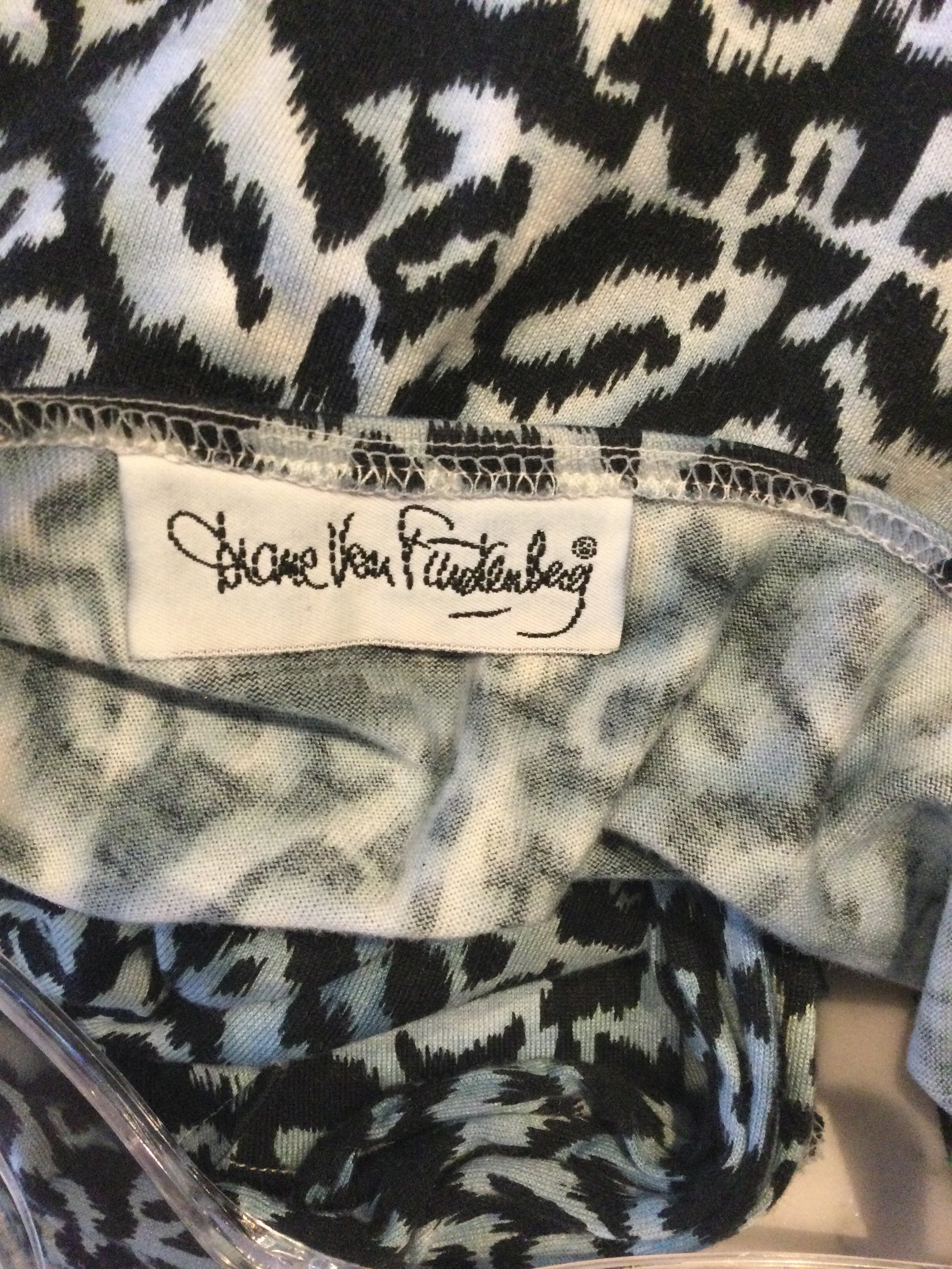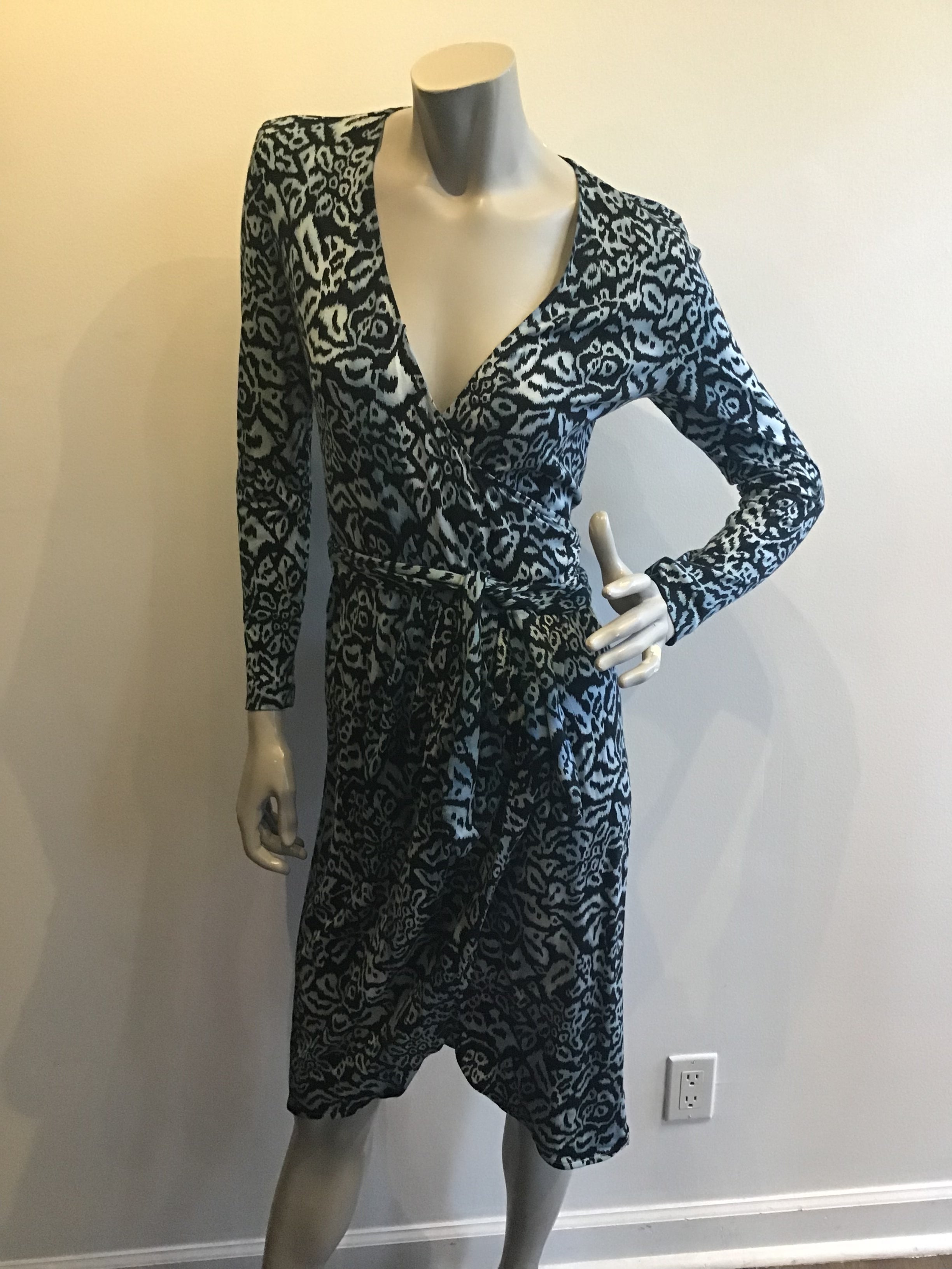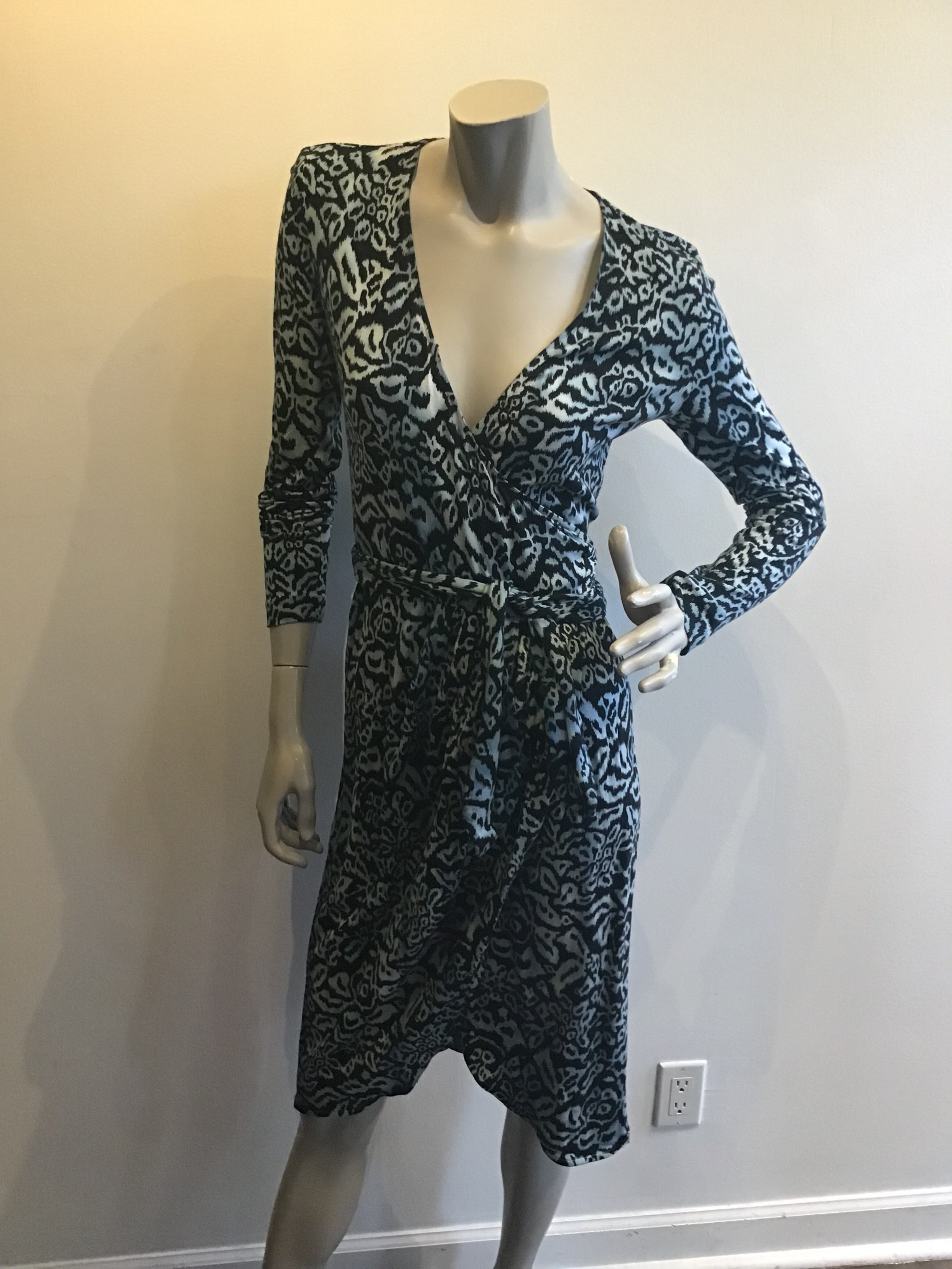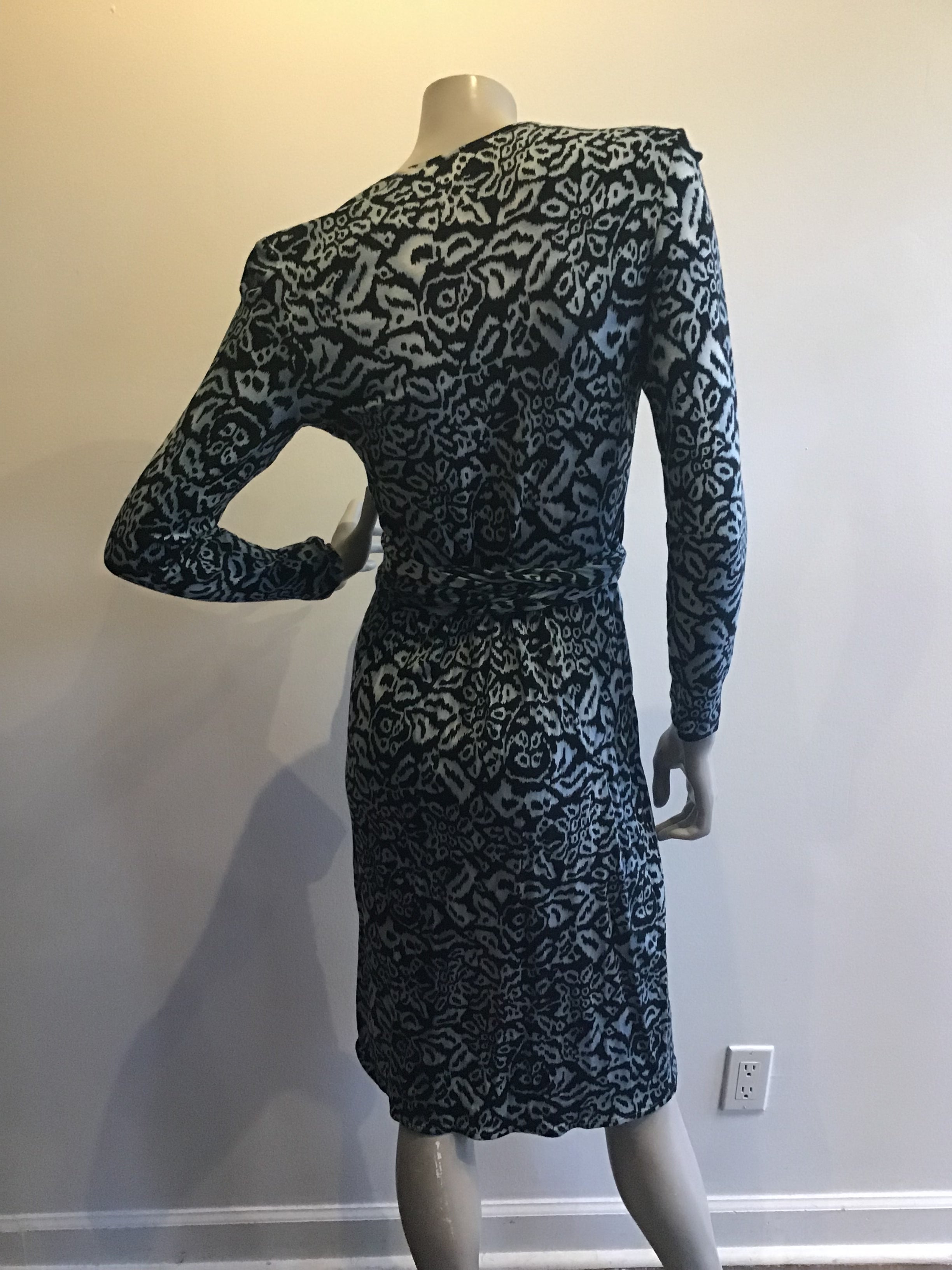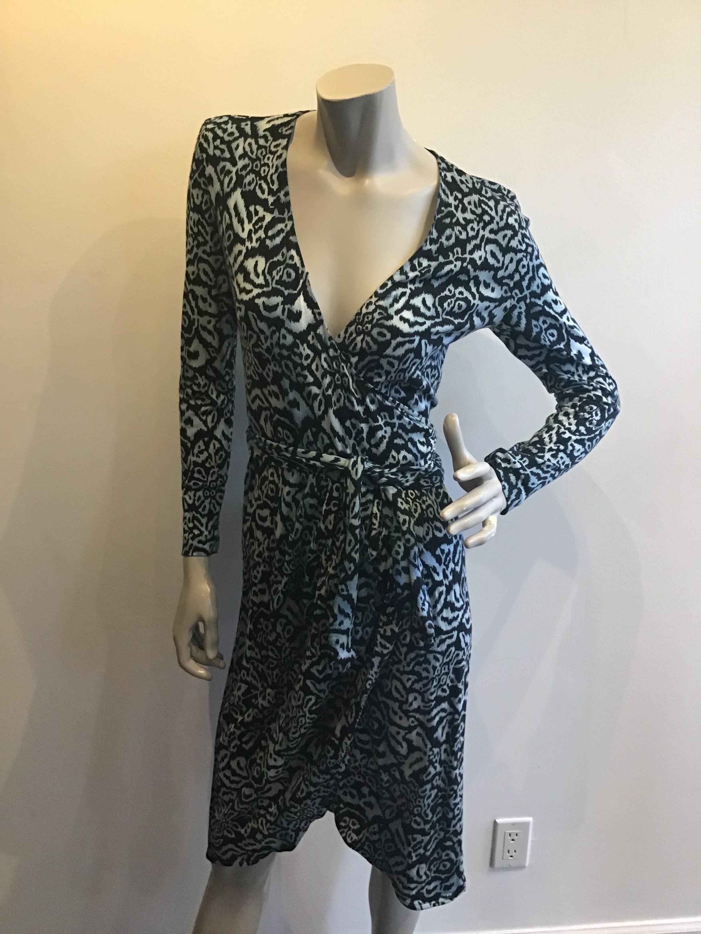 The workings woman needed clothes that were easy to put on and stylish at the same time. Diane Von Fürstenberg designed her wrap dress for her.. easy to put on put one of the tied through the slit and wrap it around and tie it.some had collars like men’s shirts. This print is black and ice blue in her cotton jersey fabric.. It is very abstract looks like a vine with flowers and leaves. The hem is rounded and goes up a little on one side. This dress is collarless forming a deep V. Measures as follows Shoulders 14, Sleeves 23, Armhole 7,/Bust up to 36, Waist up to 28, Hips up to 38, Length 42 excellent condition