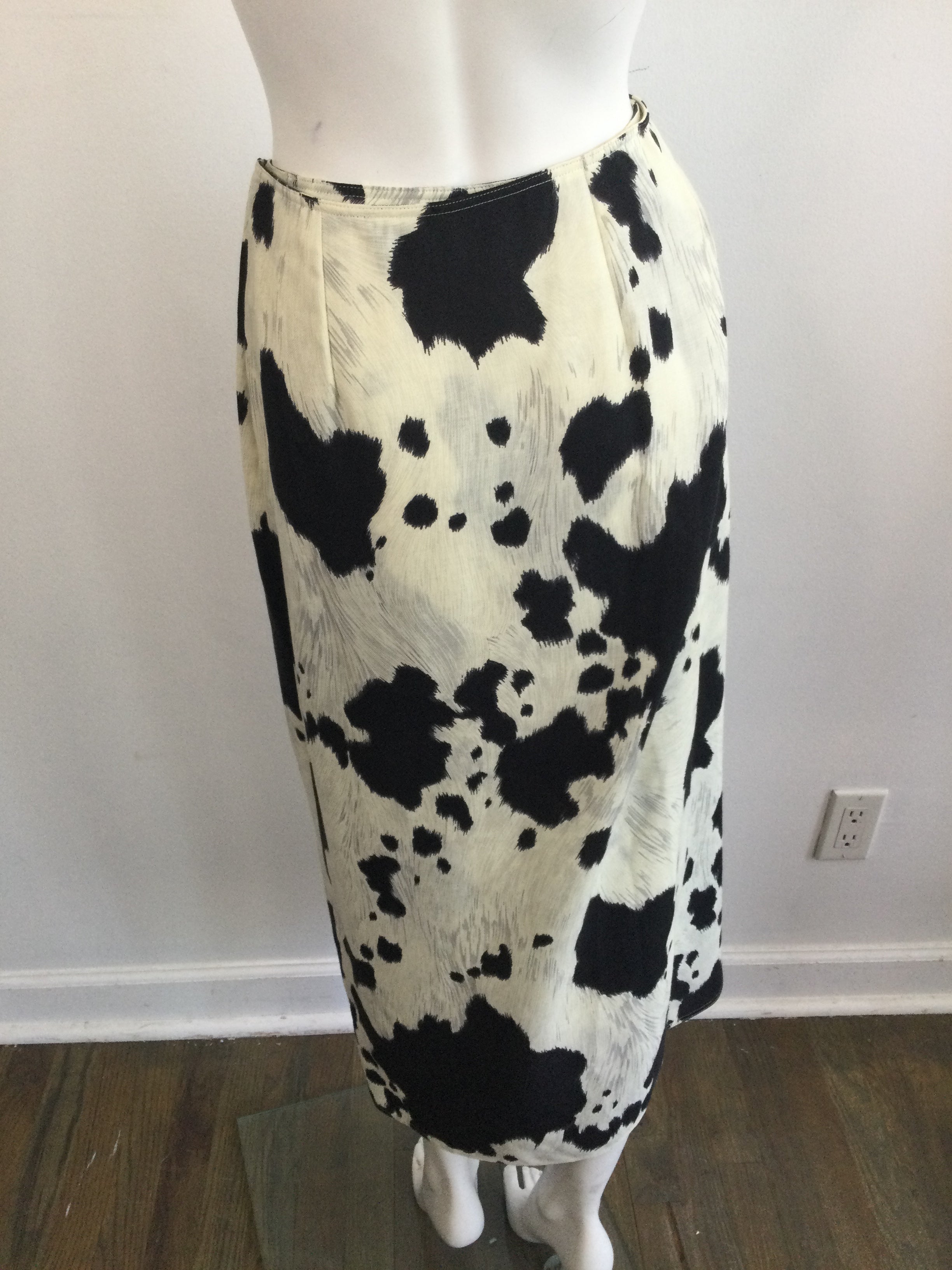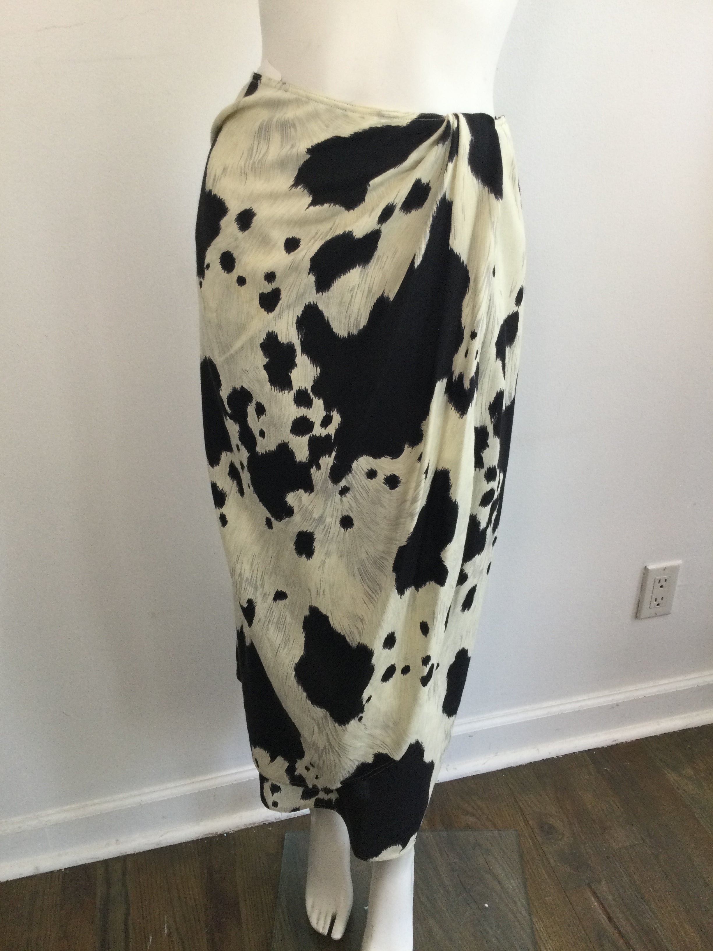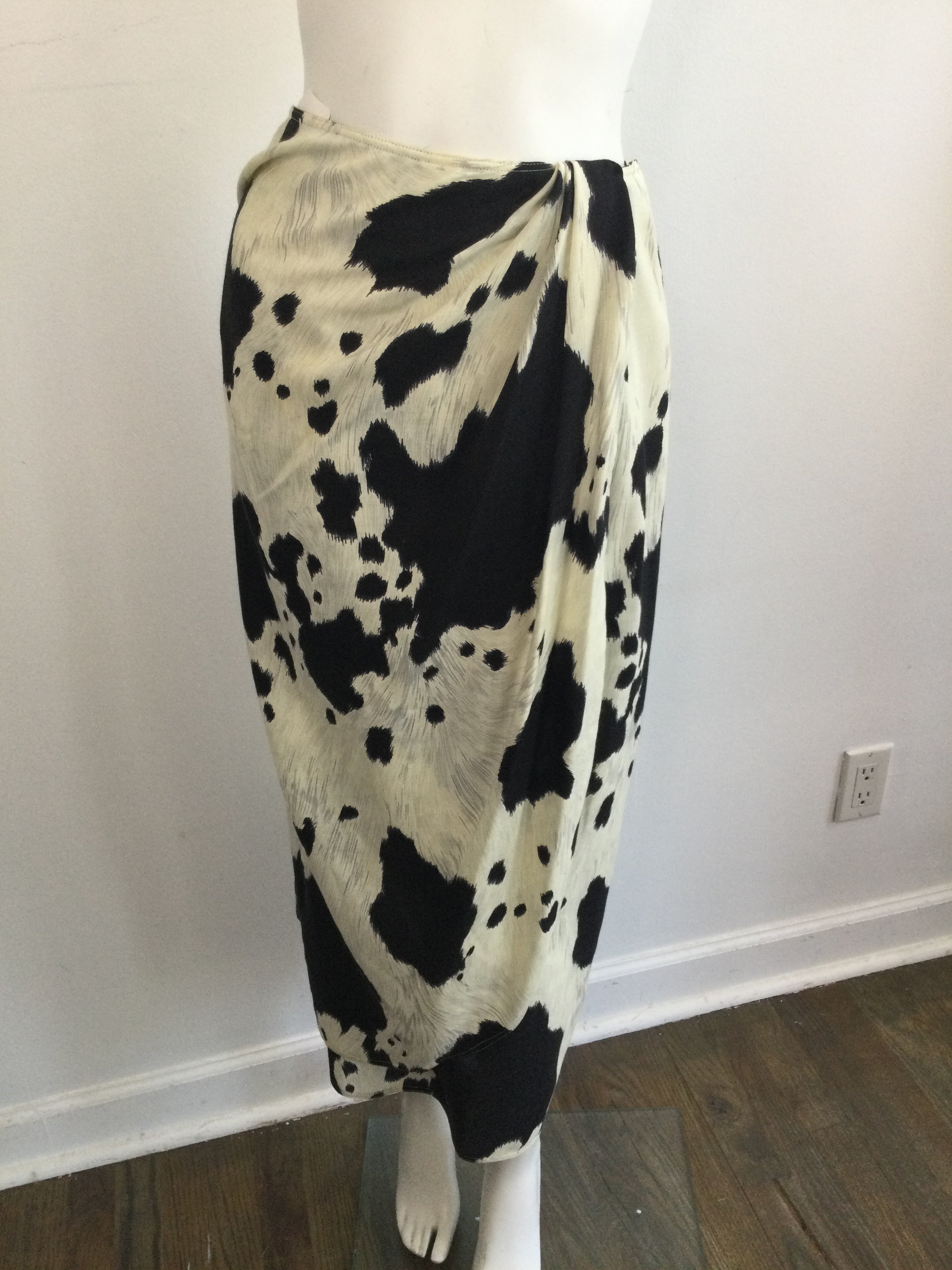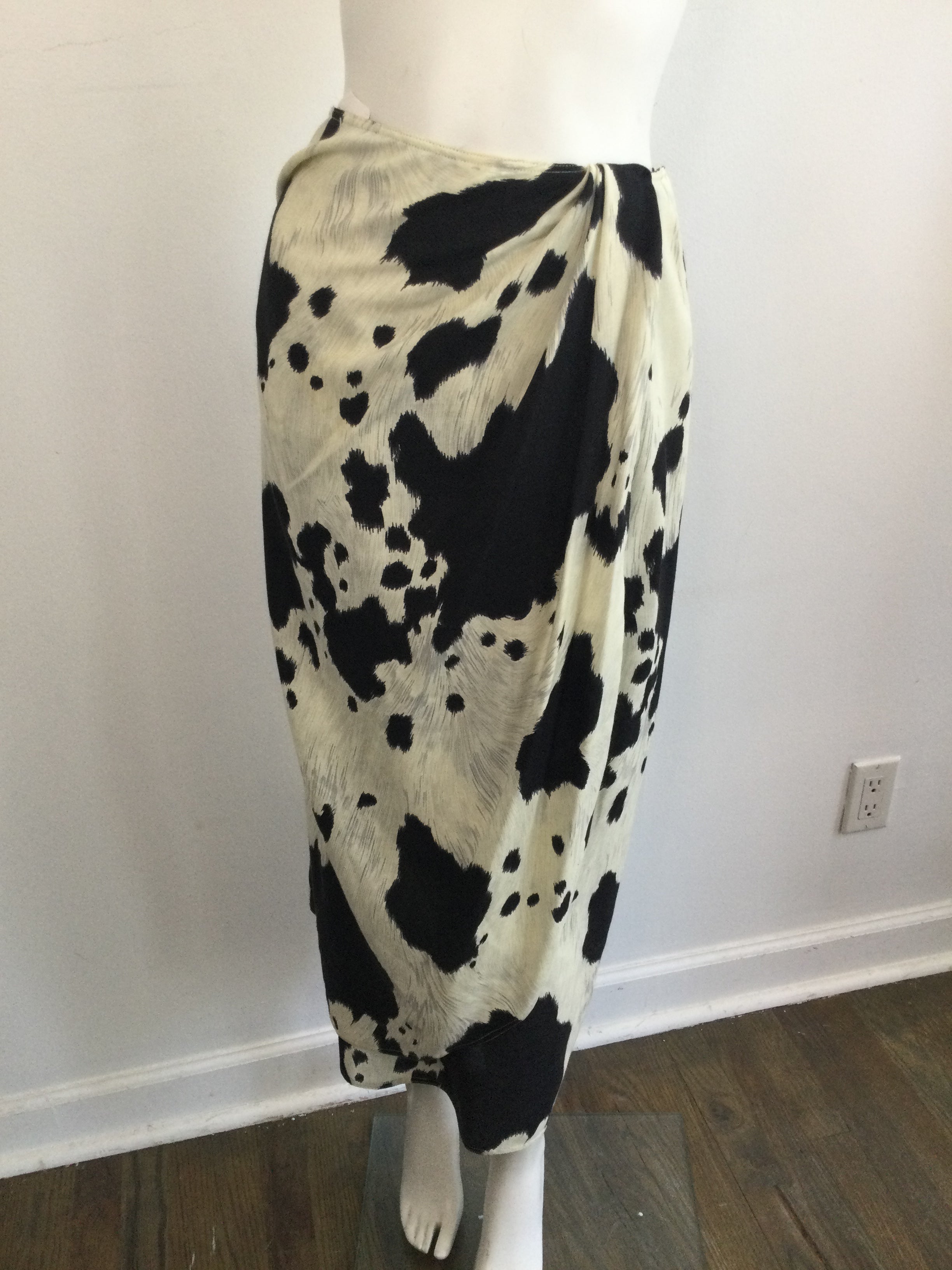 Anne Klein designs were all about comfort and ease. This sarong style skirt is definitely easy to get into one hook and eye then pull it across and Velcro it closed. The print mimics cow hide but is in a soft cotton. Measures as follows Waist 30, Hips 40, Length 36 Excellent condition