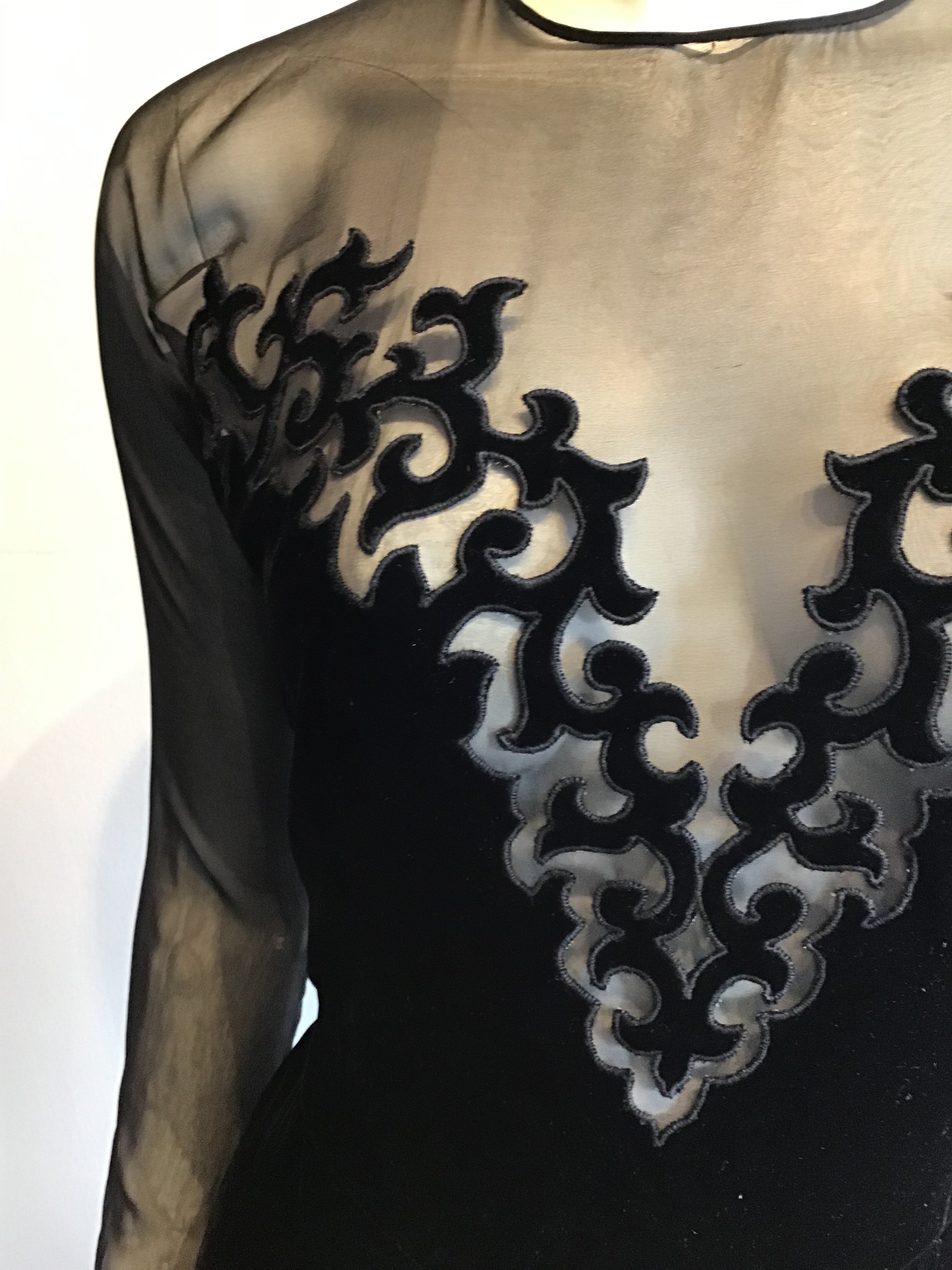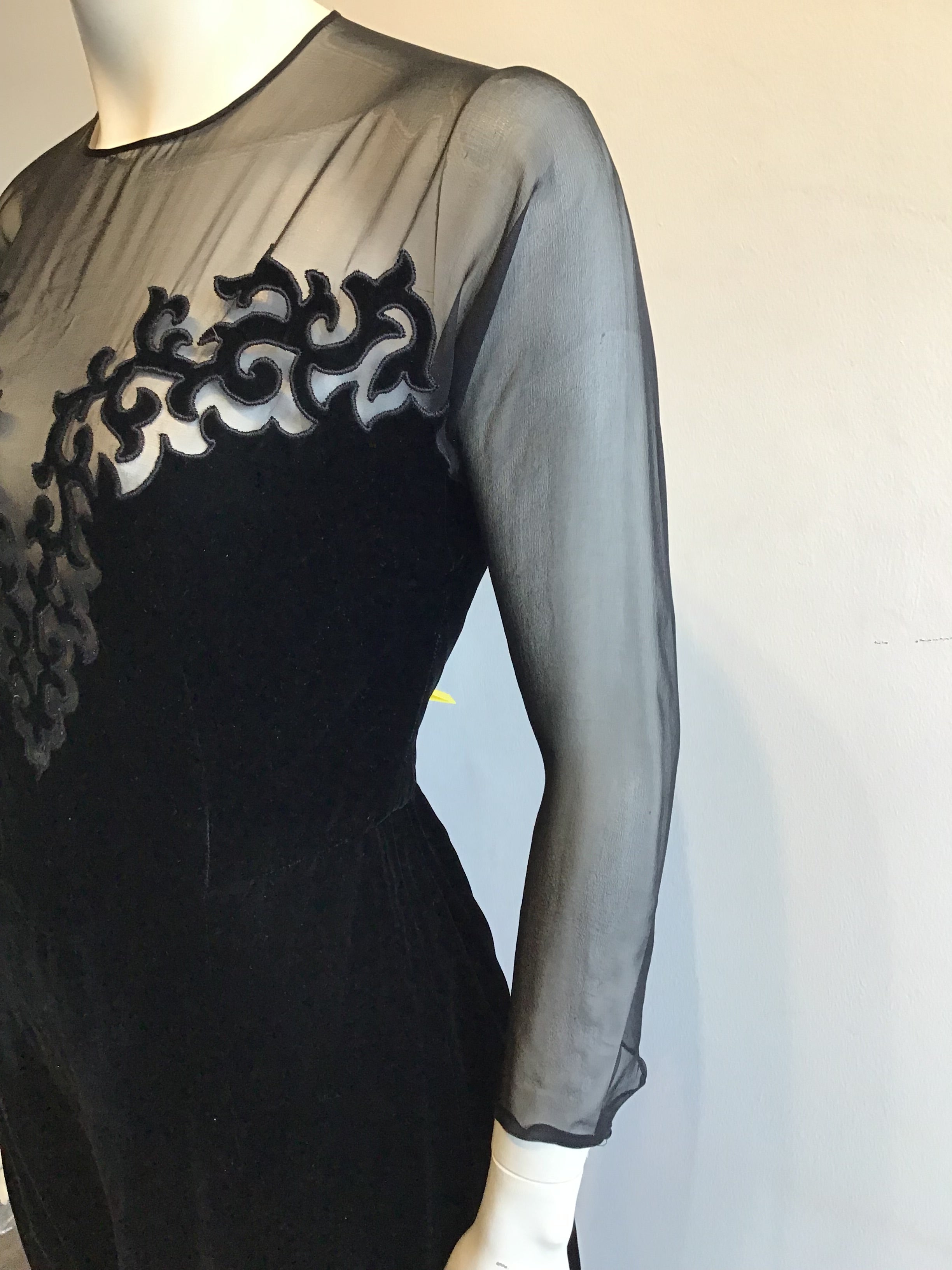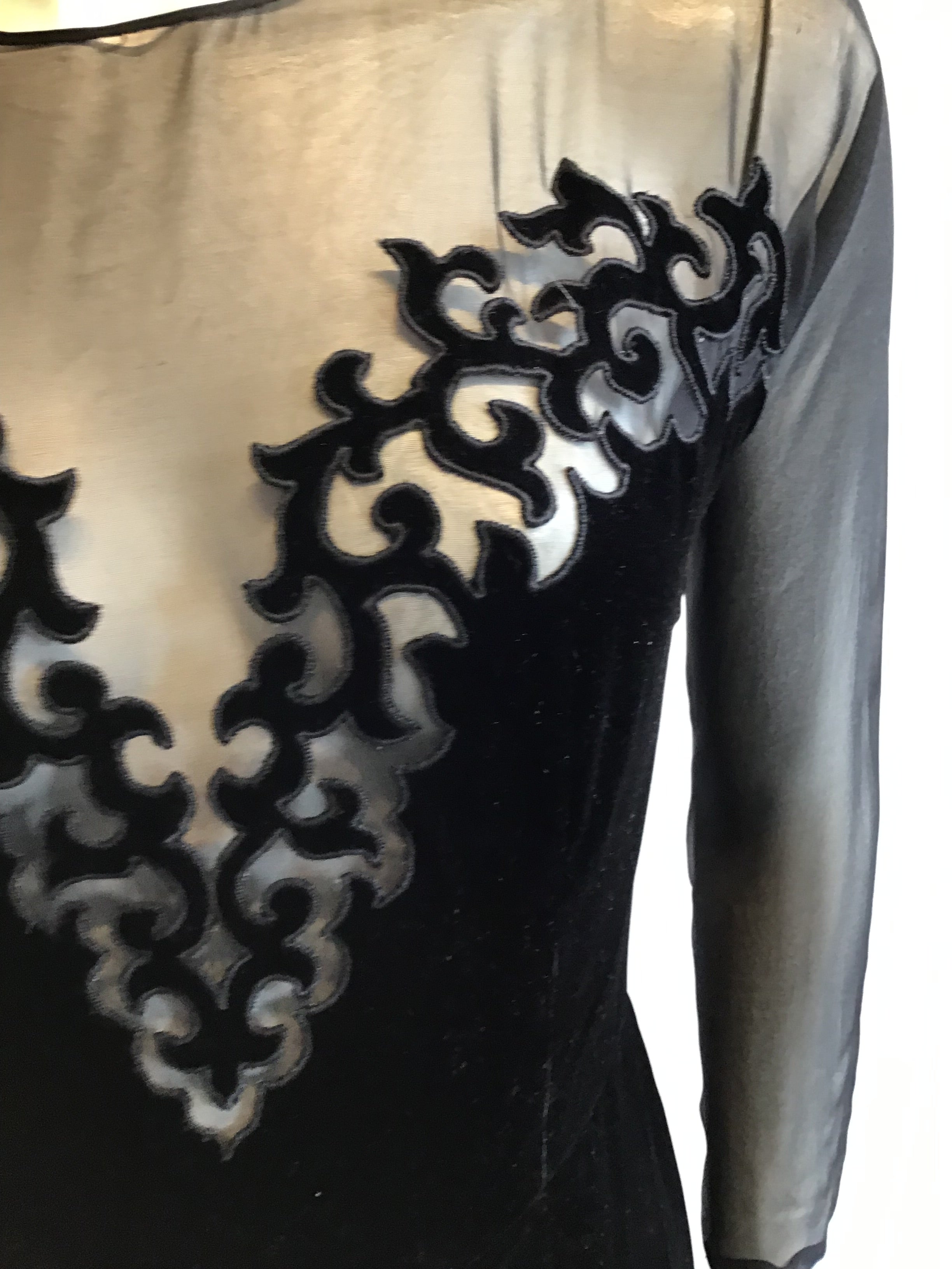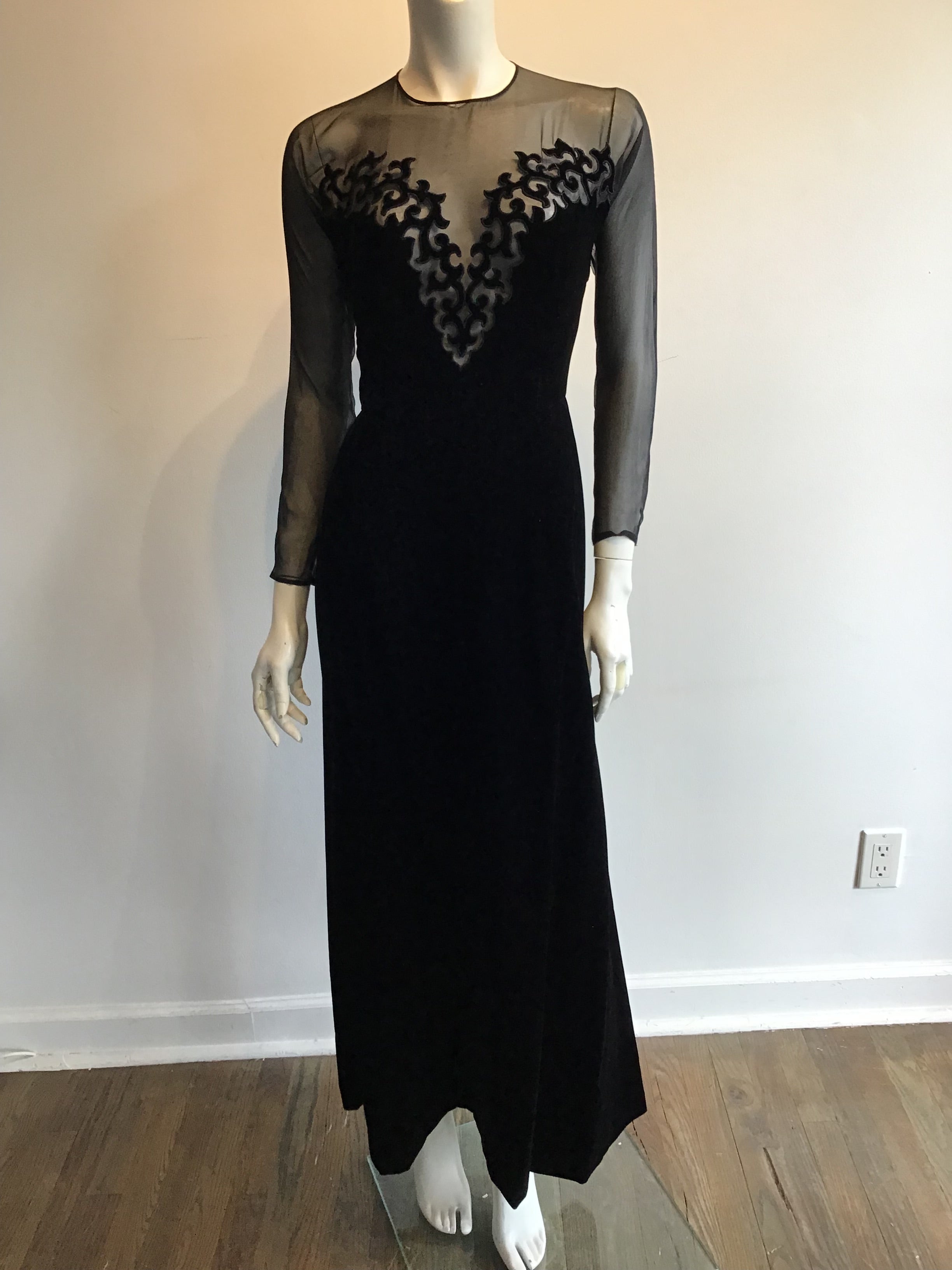 Oscar de La Renta apprenticed with Balenciaga and learned every detail of the business from the maestro. To incorporate silk velvet onto chiffon is pure talent. The round collar of the chiffon is double rolled so it lays perfectly on the neck. The sleeves are slight dolmen in style to give some extra room for movement. Velvet was cut in a scroll pattern and applied to the chiffon on the plunging neckline. Designed to fit the body through the hips with a slight flare at the hem. Measures as follows Shoulders 15, Sleeves 23, Armhole 8.5, Bust 36, Waist 28, Hips 38, Length 54 Excellent condition This dress came out of an estate that the owner only wore her dresses once or not at all. There are no marks to the velvet