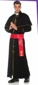 This classic priest costume is ideal for stage performances, costume parties, Halloween, and any other costume event. This costume is a full length robe with a detachable white collar and sash with embroidered cross.