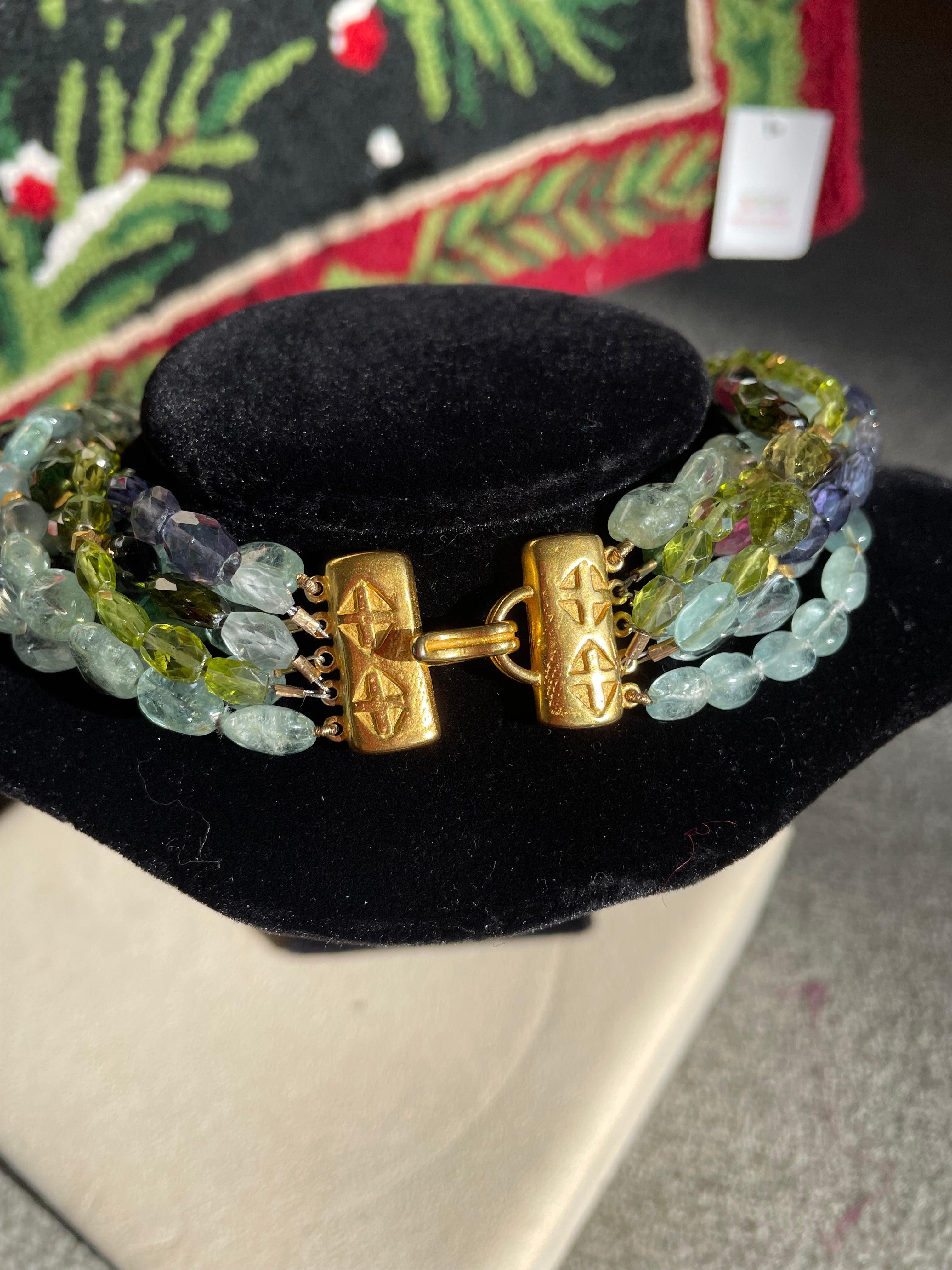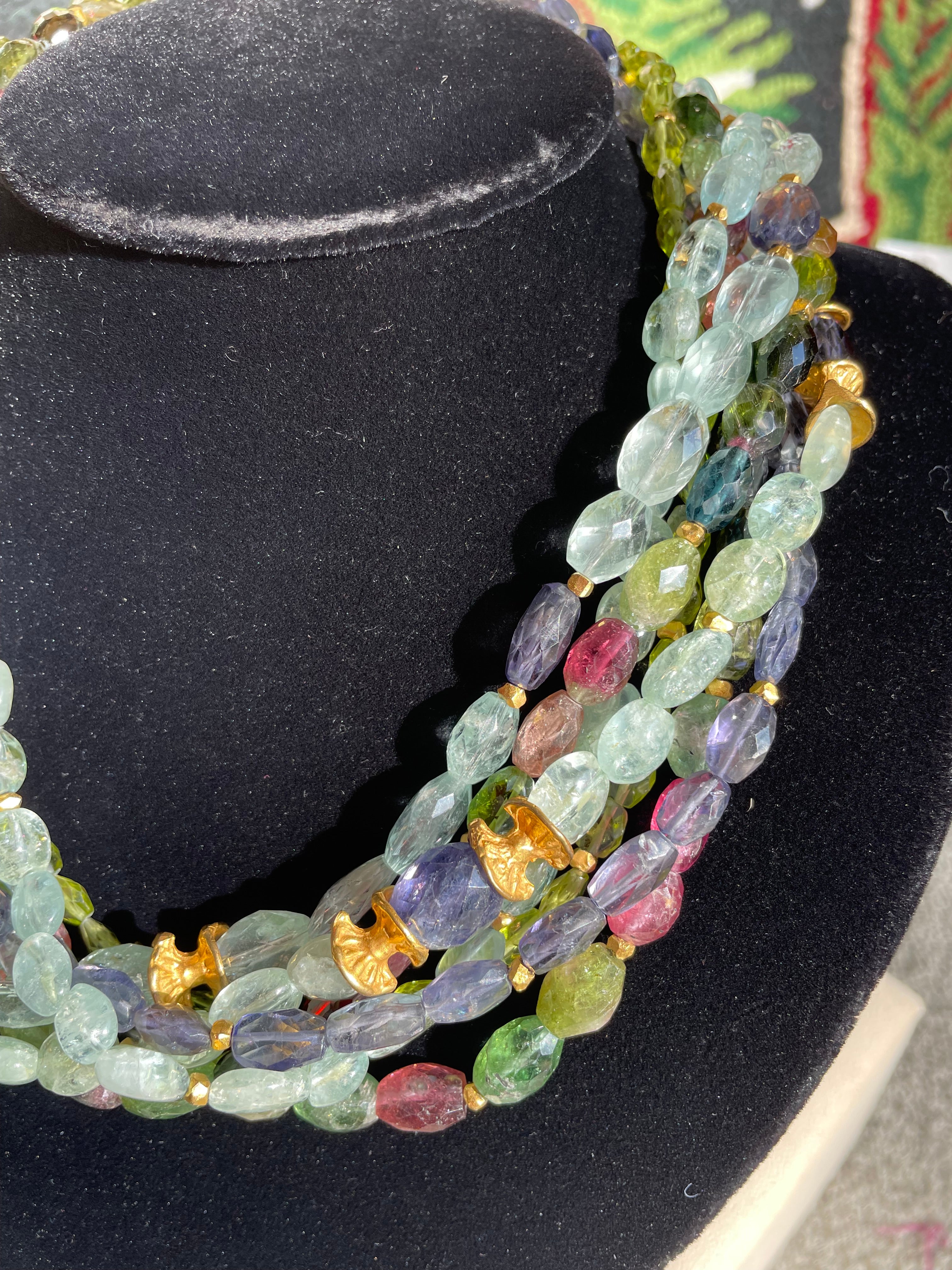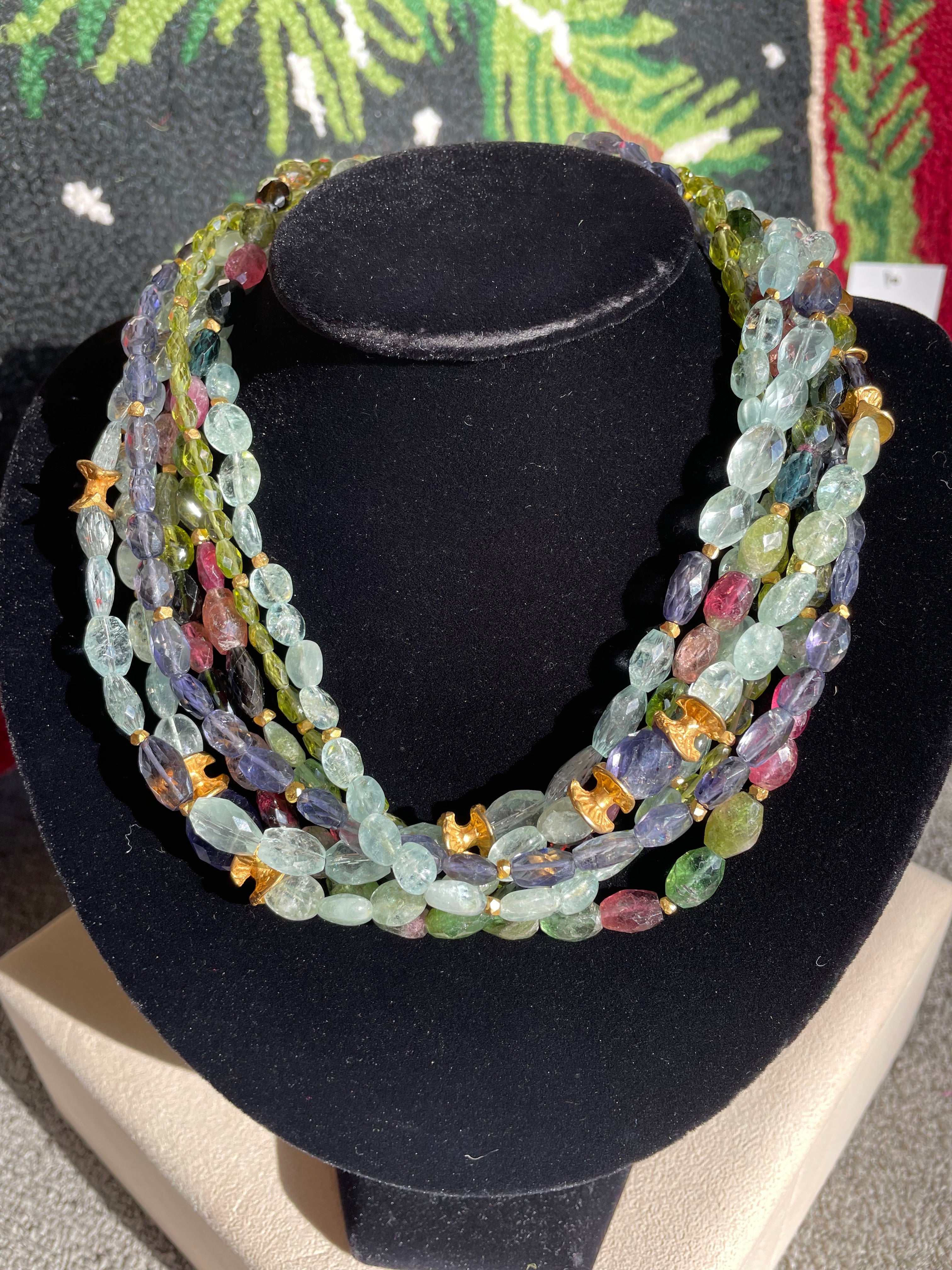 Offered for sale is a gorgeous multistrand necklace of semiprecious stones. Made by the company Jaded in the ninties this necklace is in perfect condition. The necklace consists strands of mixed iolite, peridot,aquamarine, and various tourmelian stone beads. The length of the necklace is 16 inches and closes with a hook clasp. preowned