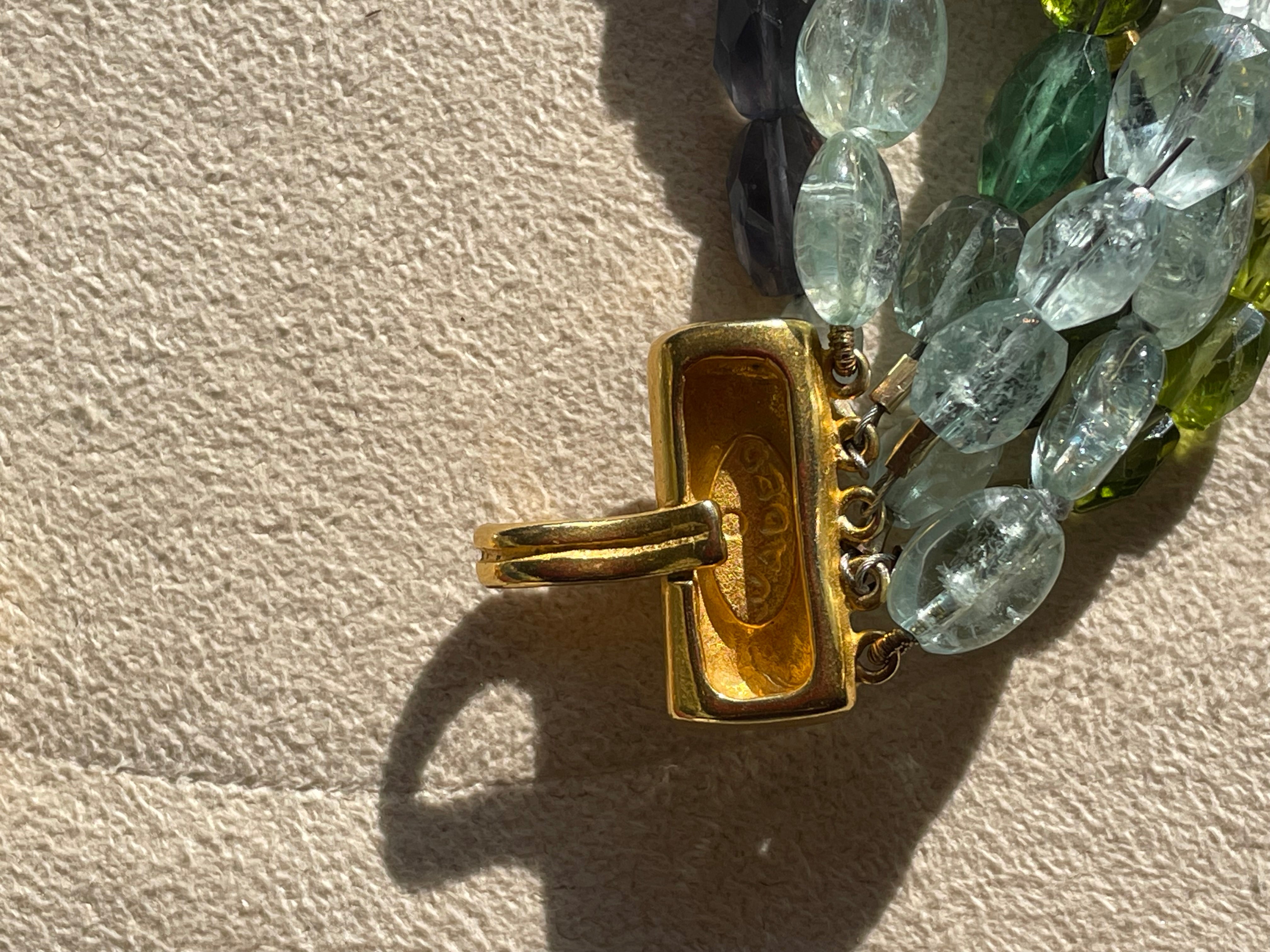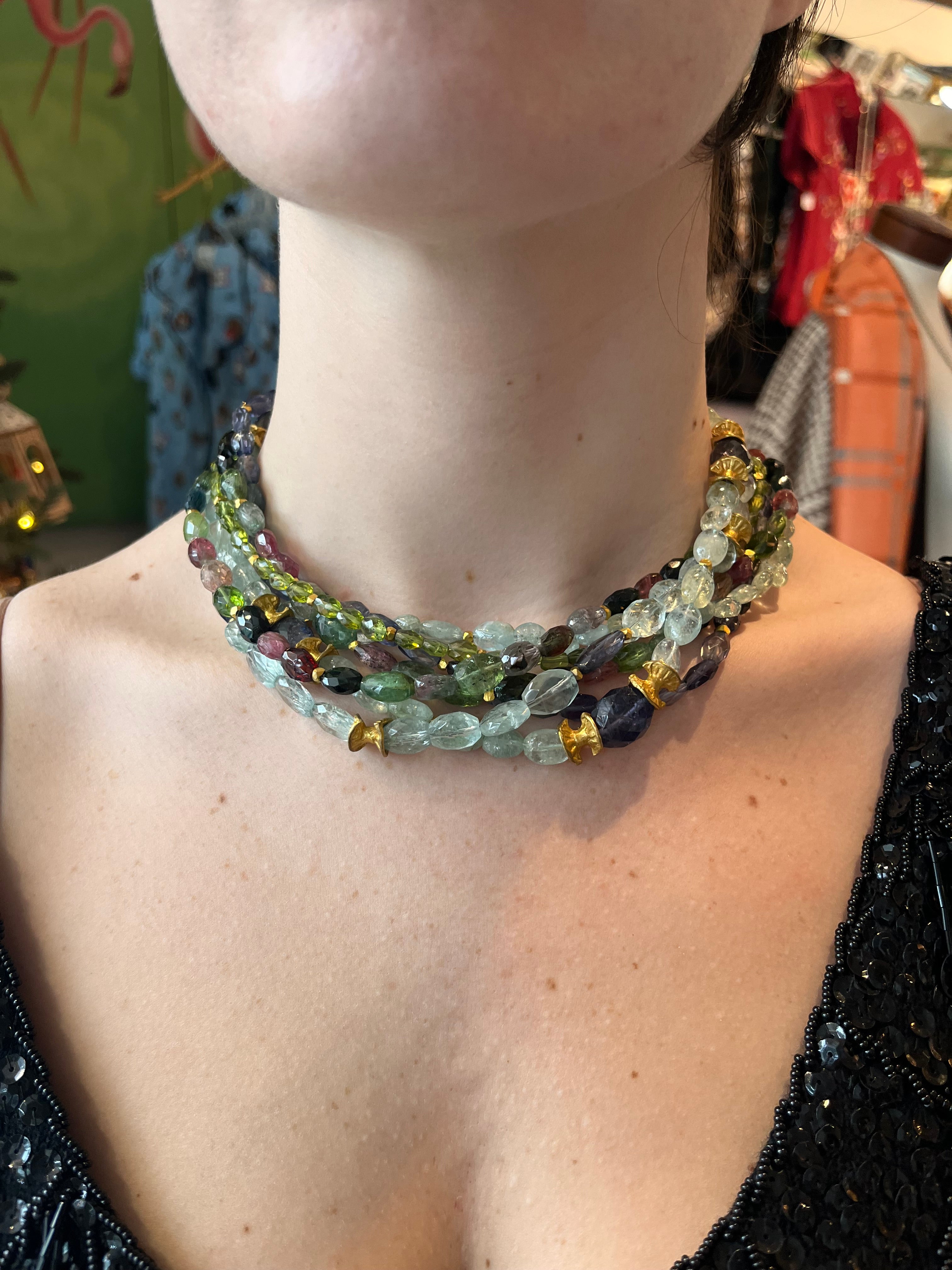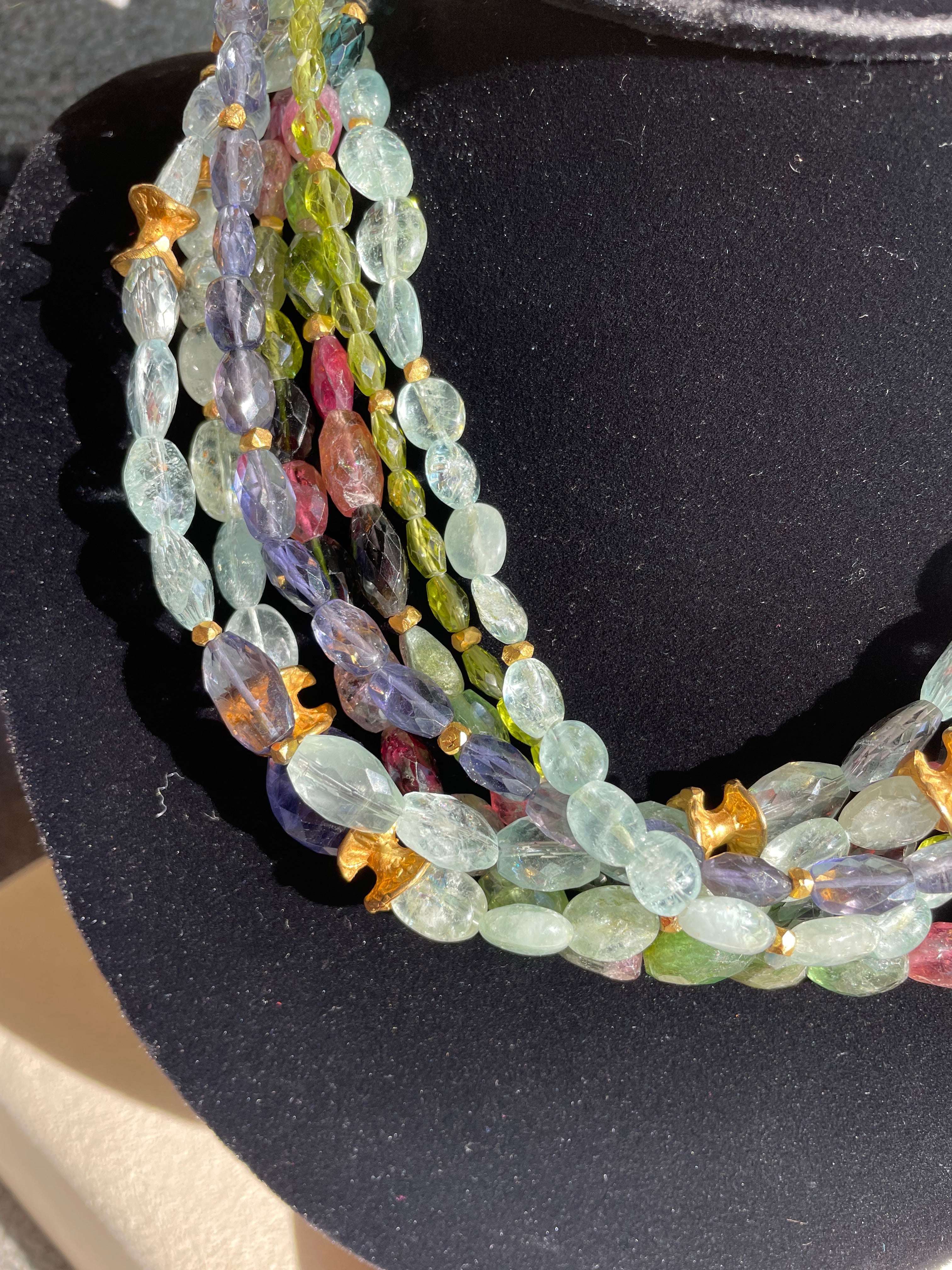Offered for sale is a gorgeous multistrand necklace of semiprecious stones. Made by the company Jaded in the ninties this necklace is in perfect condition. The necklace consists strands of mixed iolite, peridot,aquamarine, and various tourmelian stone beads. The length of the necklace is 16 inches and closes with a hook clasp. preowned