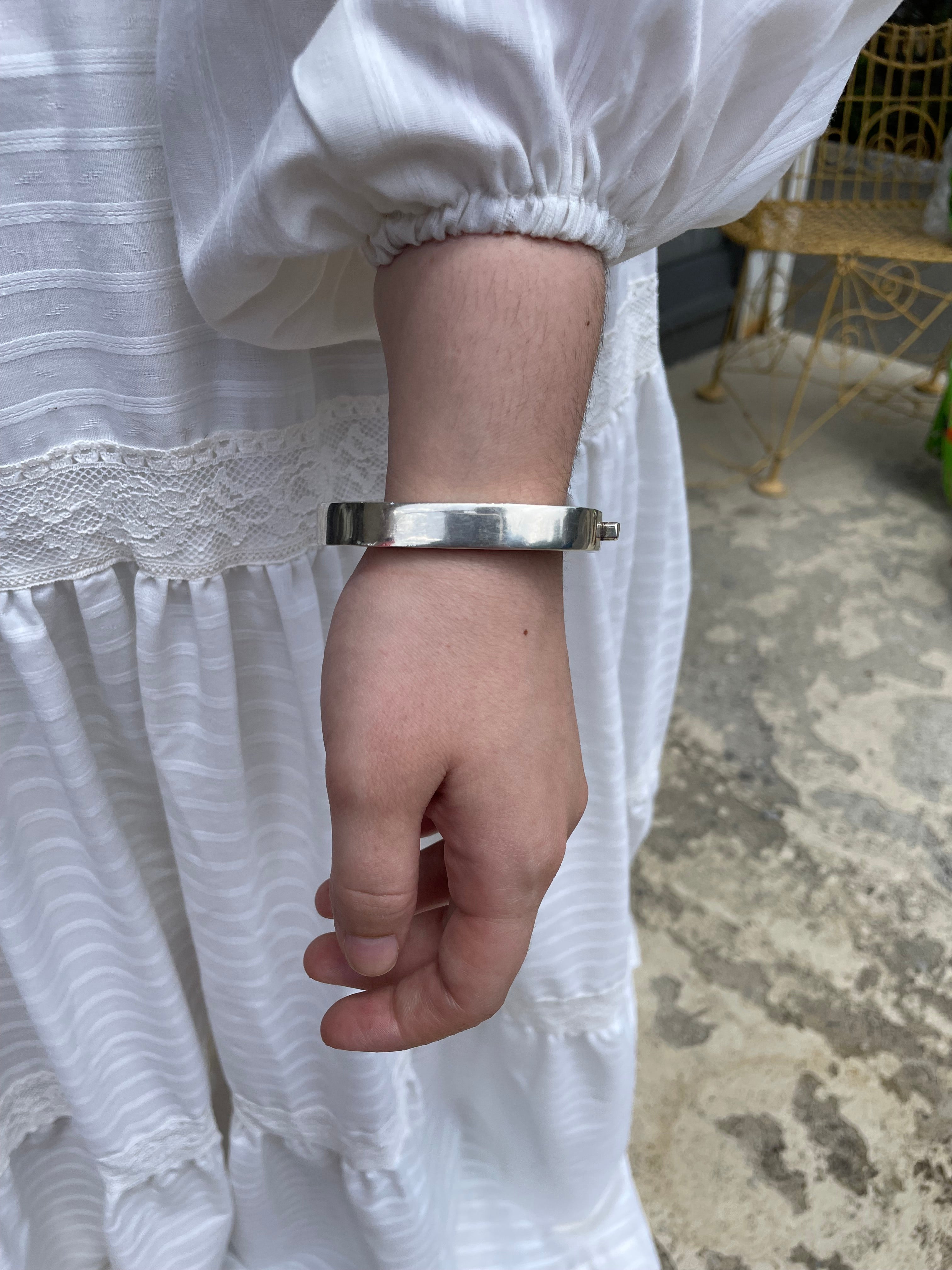 Vintage 1970's heavy sterling bangle made in Mexico with squared edges. {Two available but purchased separately} Each bangle weighs approximately 43.2 grams. Has slide in clip closure and are in excellent vintage condition with slight wear but no dents. Signed TA Mexico and 925. Hinged for easy on and off . Inside circumference 7 inches. Please email any questions as I do not accept returns.