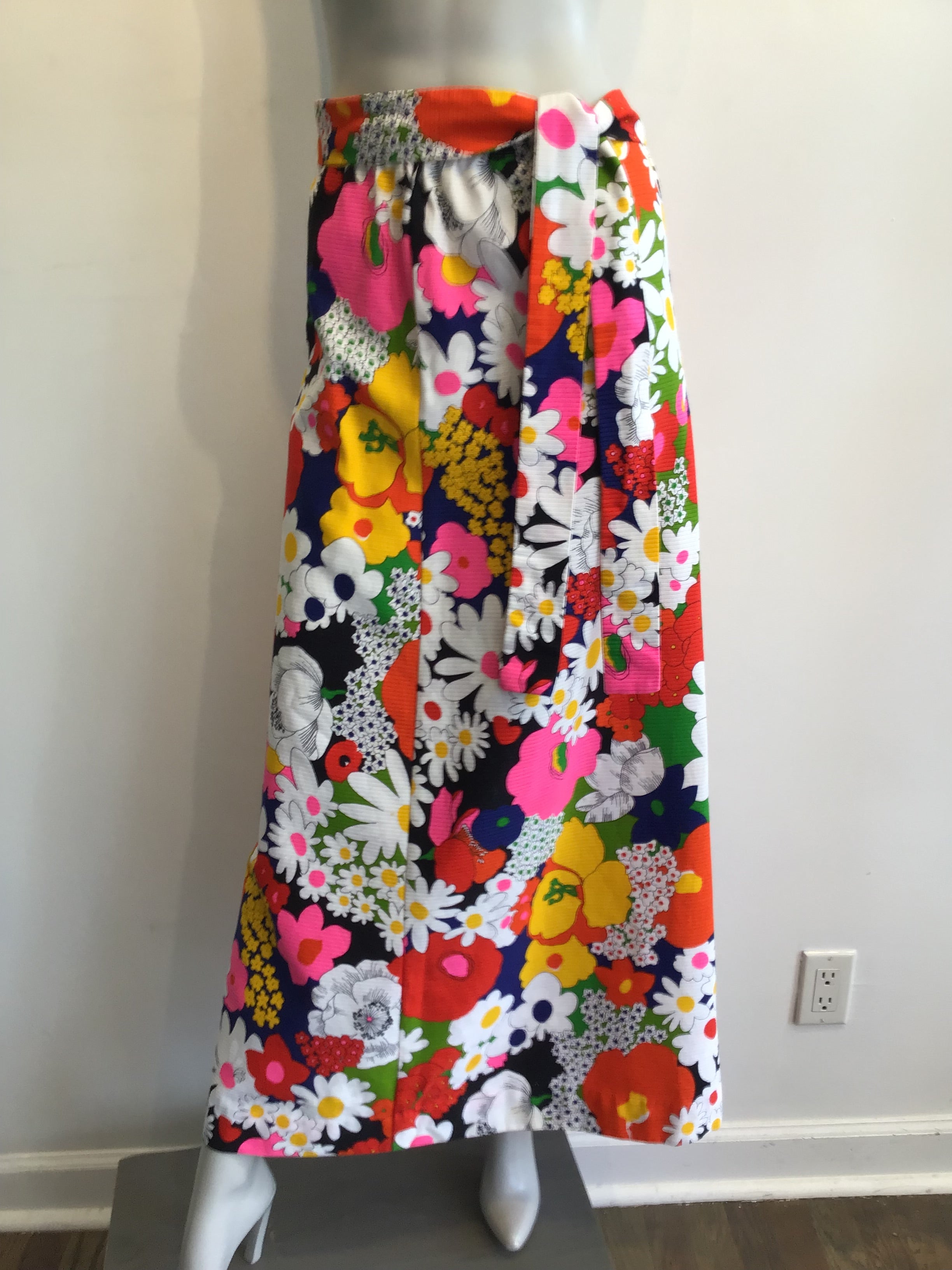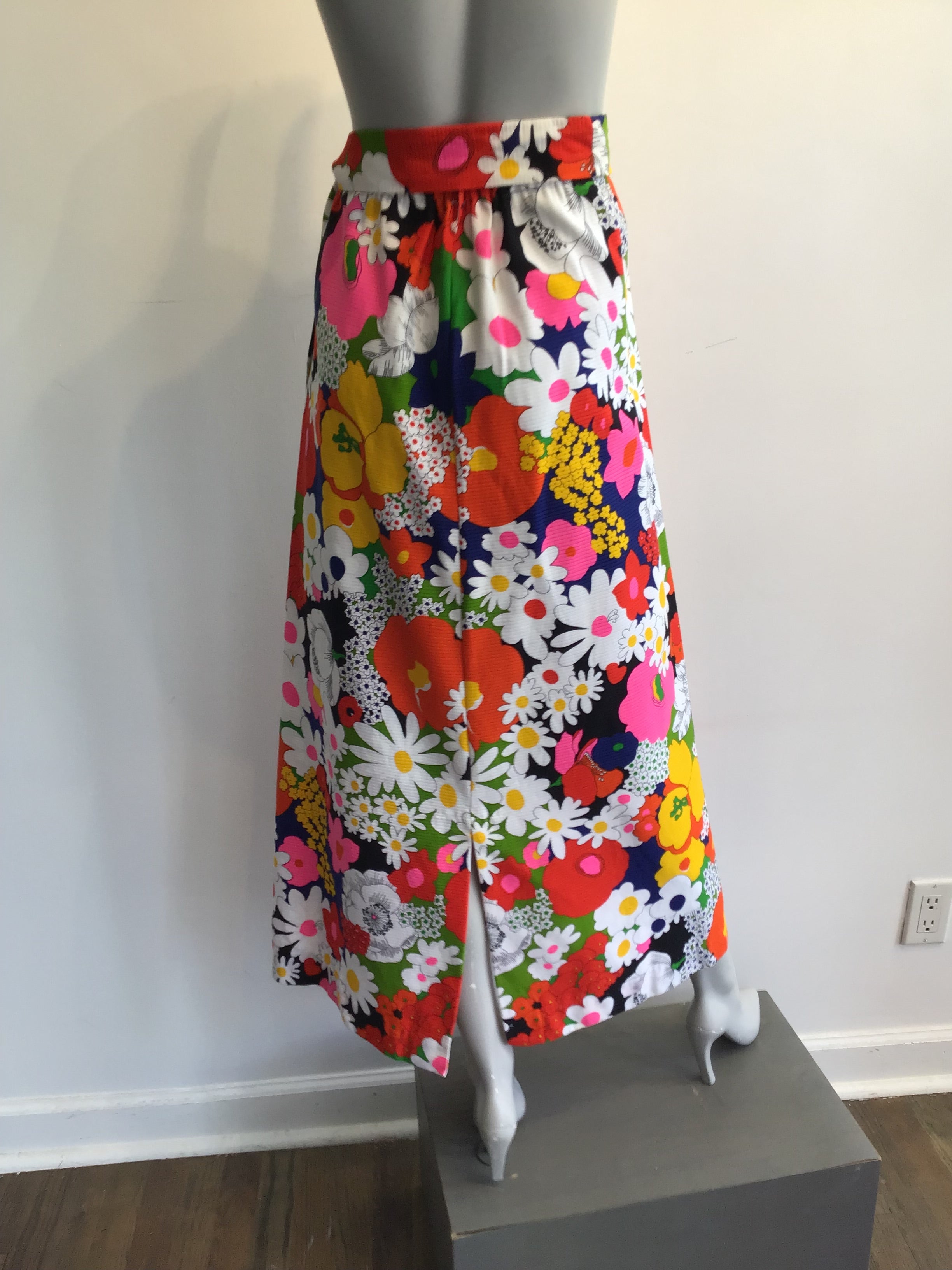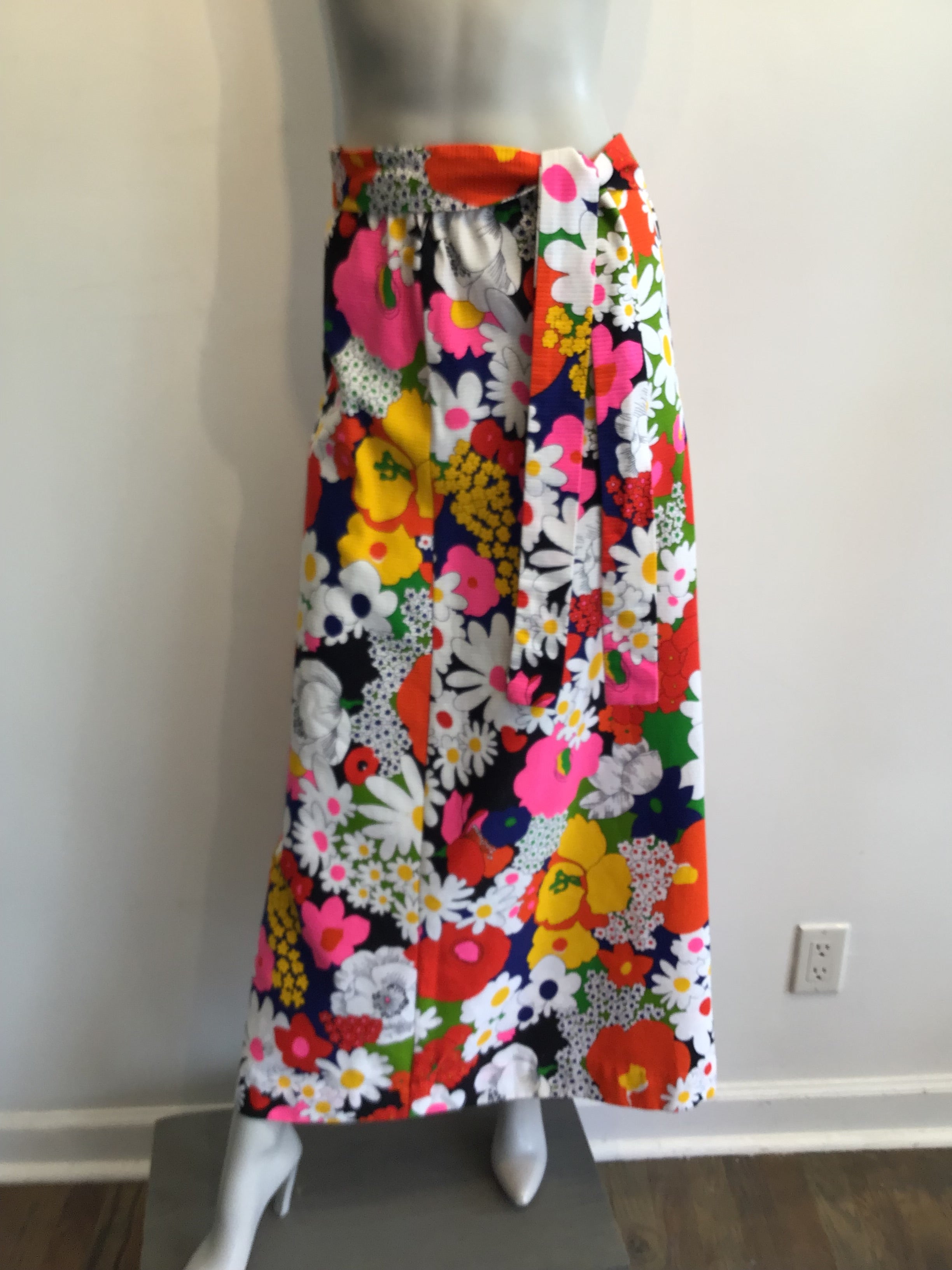 Can you picture Carol Brady wearing this. Maxi skirt made from cotton piqué. Piqué means there is texture usually waves or lines. The print is large flowers done in a Peter Max style. The skirt has a slight flair on the bottom. Does come with the matching belt. Measures as follows Waist 32, Hips 40, Length 38 the elastic in the waistband is loose and should be replaced