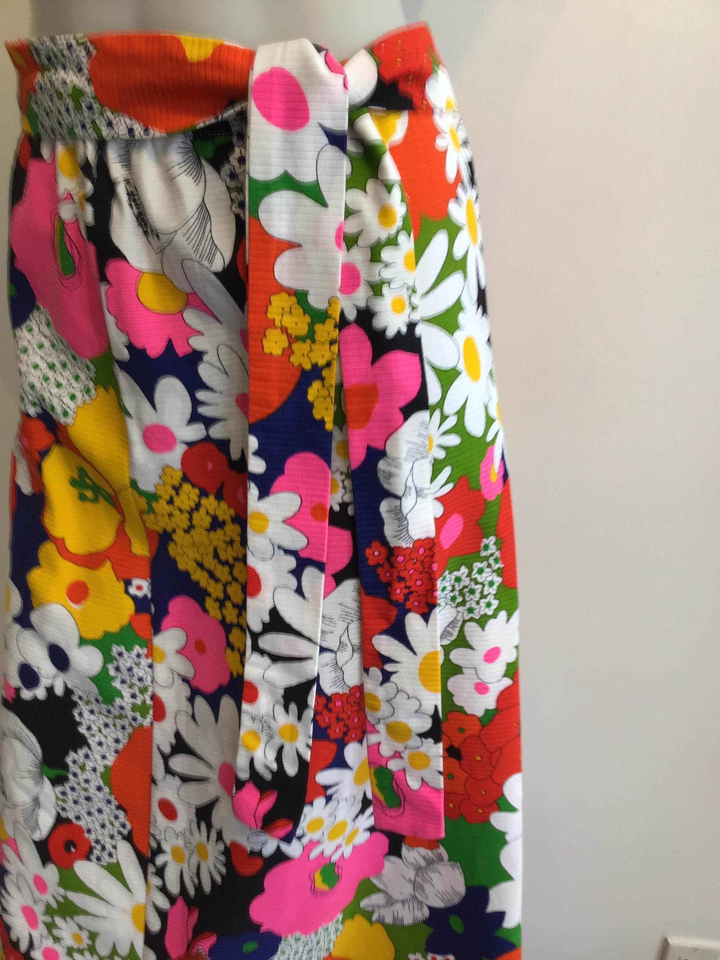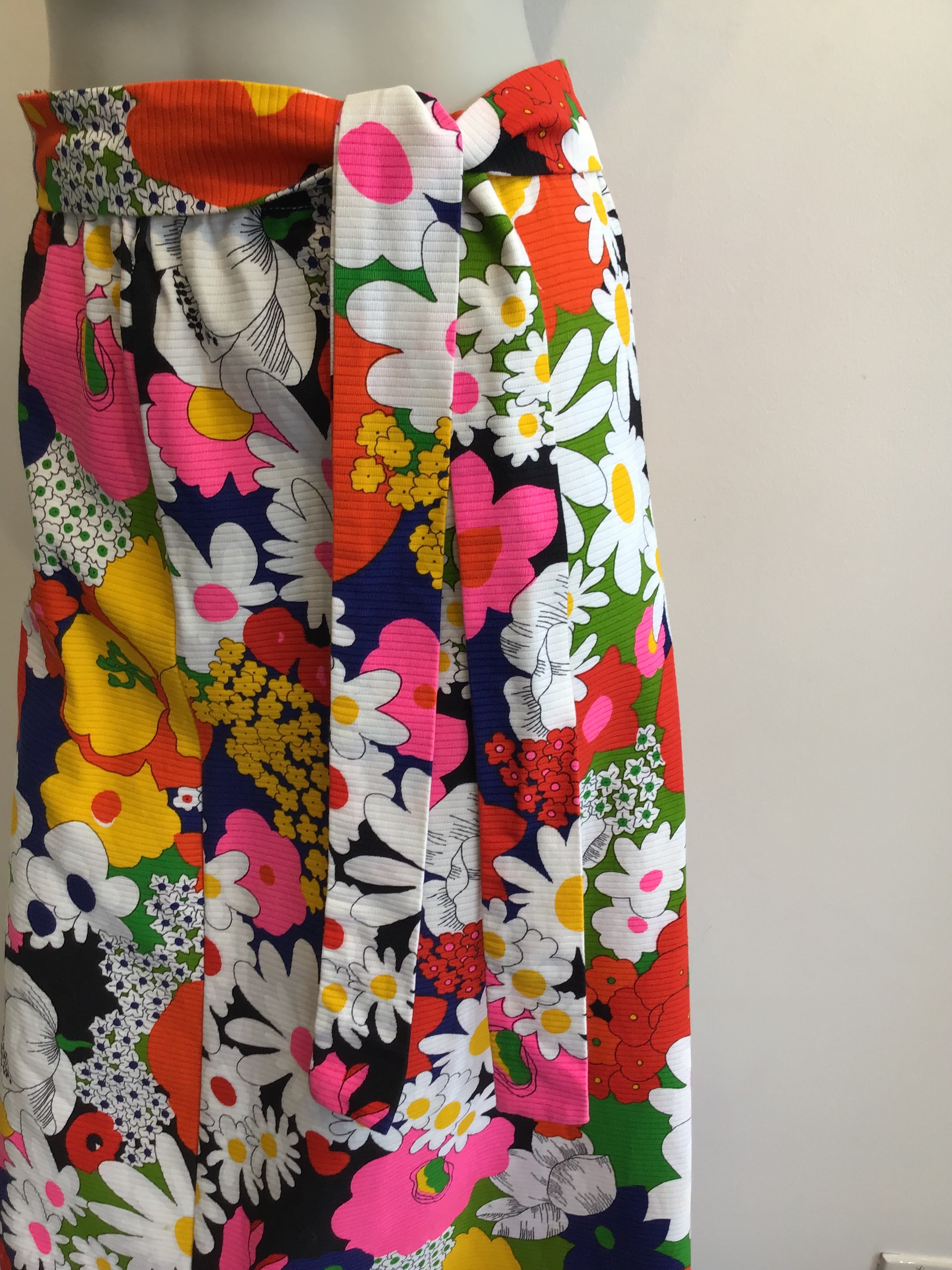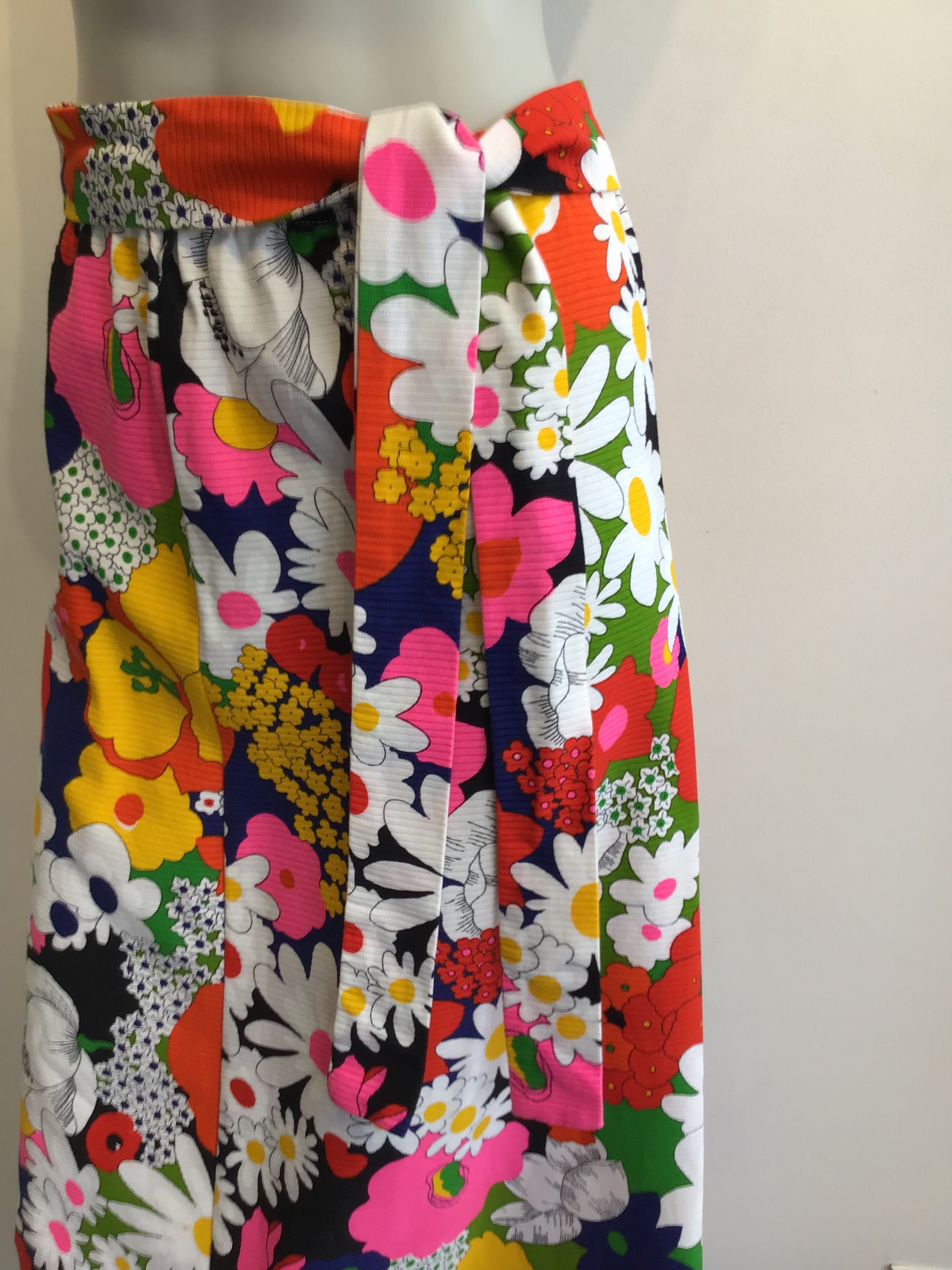 Can you picture Carol Brady wearing this. Maxi skirt made from cotton piqué. Piqué means there is texture usually waves or lines. The print is large flowers done in a Peter Max style. The skirt has a slight flair on the bottom. Does come with the matching belt. Measures as follows Waist 32, Hips 40, Length 38 the elastic in the waistband is loose and should be replaced